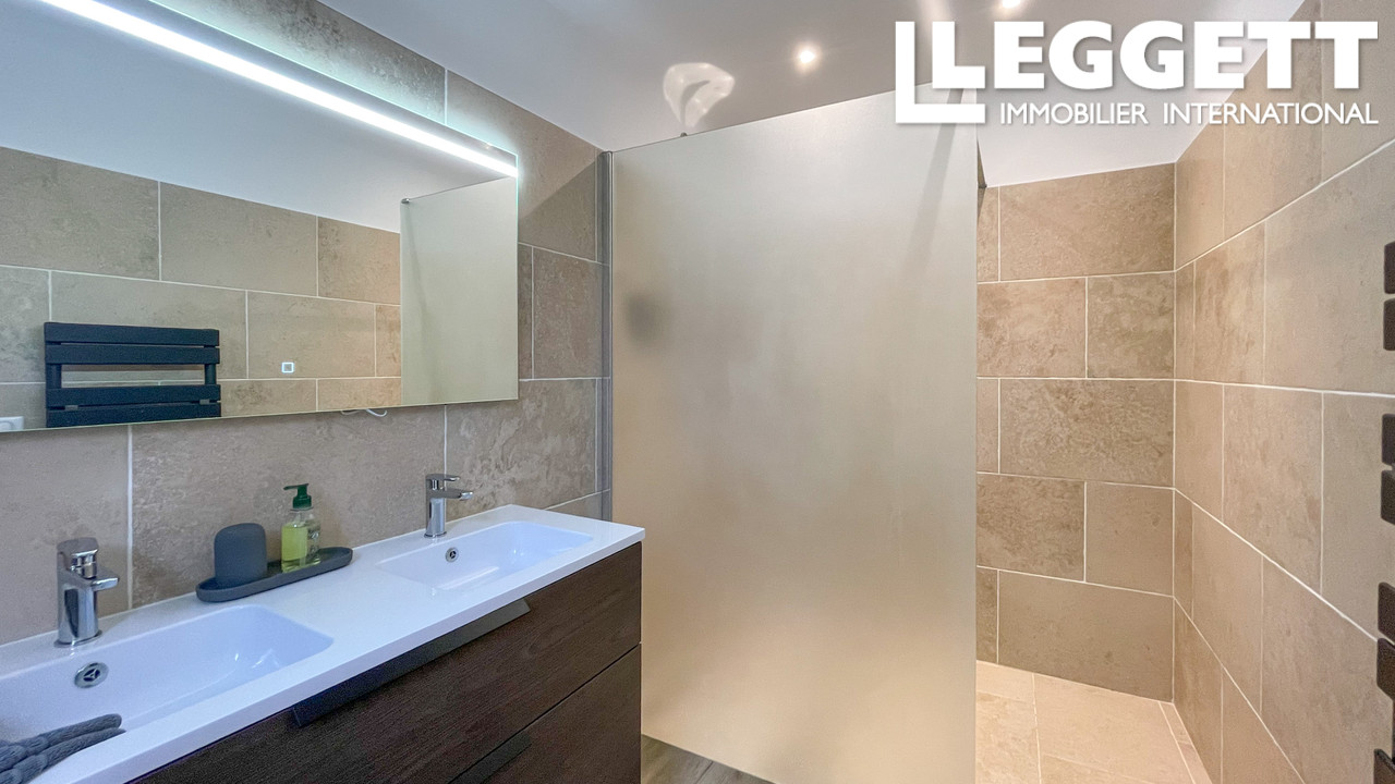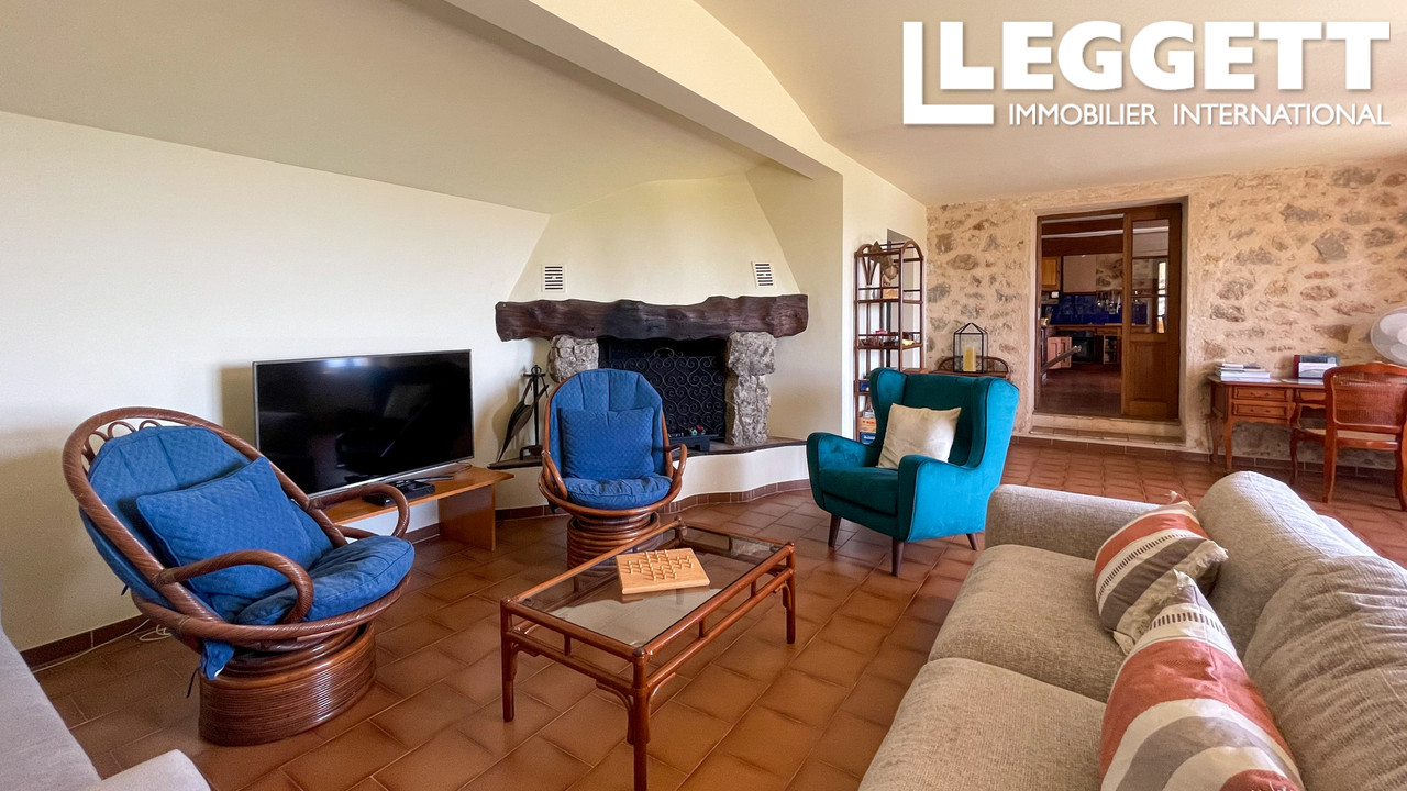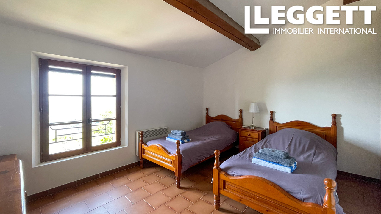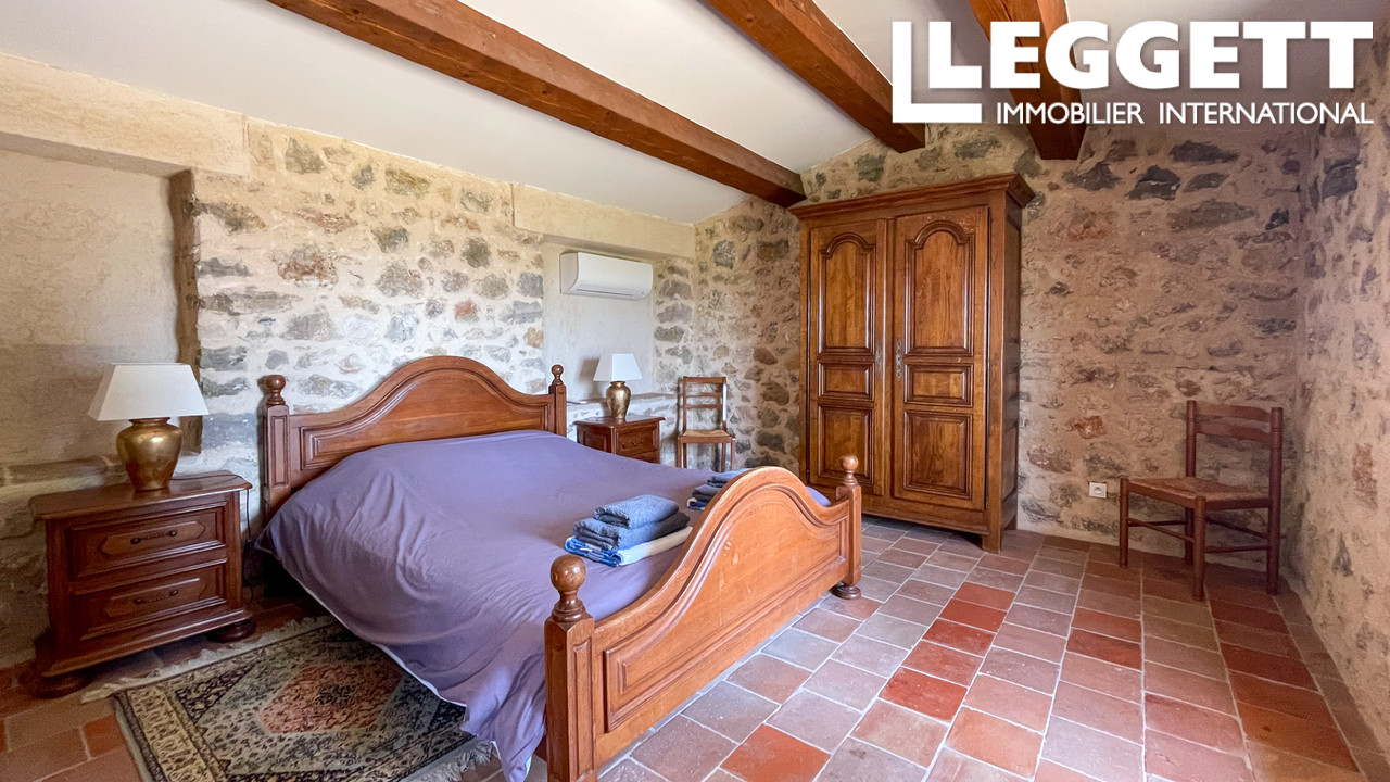Cette spacieuse maison de 5 chambres comprend une suite parentale avec salle de bains privative, la climatisation dans toutes les chambres, et une chambre au dernier étage avec salle d'eau privative et vue imprenable. Le rez-de-jardin comprend un salon chaleureux avec cheminée à foyer ouvert, une cuisine traditionnelle de ferme avec poutres apparentes et cellier, des toilettes invités et une chambre supplémentaire avec salle de bains privative. Des portes-fenêtres s'ouvrent sur une terrasse couverte avec barbecue, idéale pour les repas en plein air.