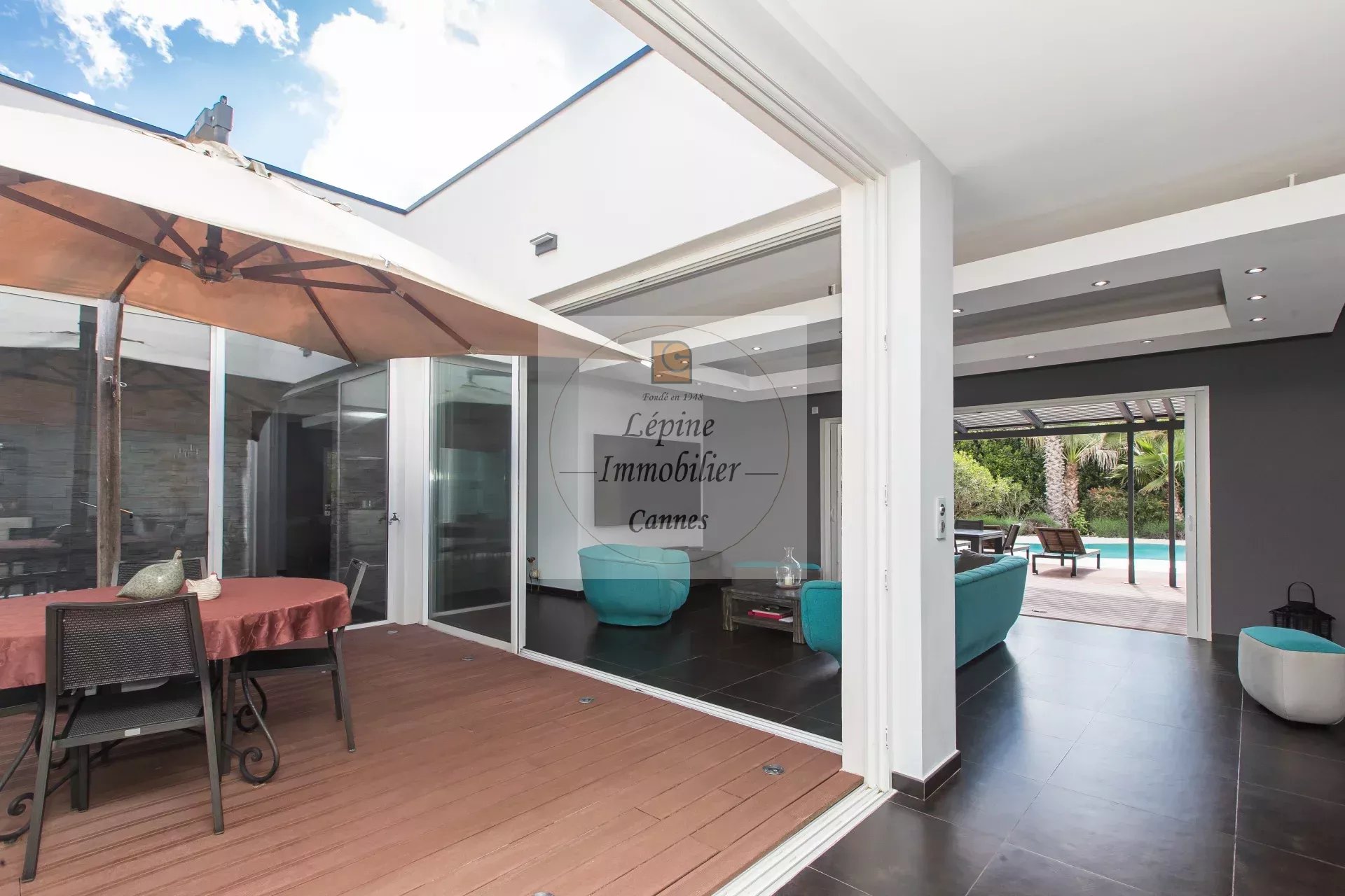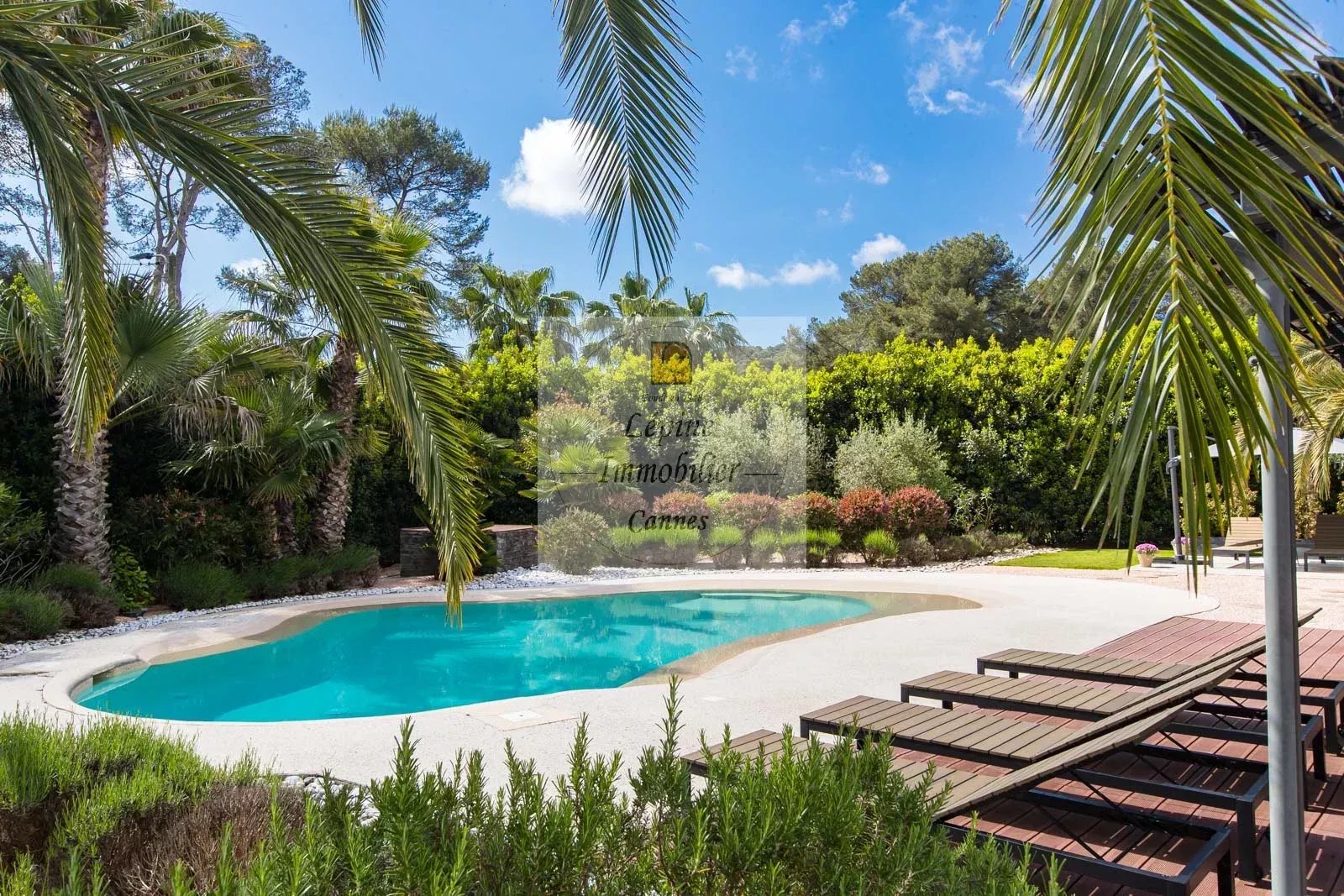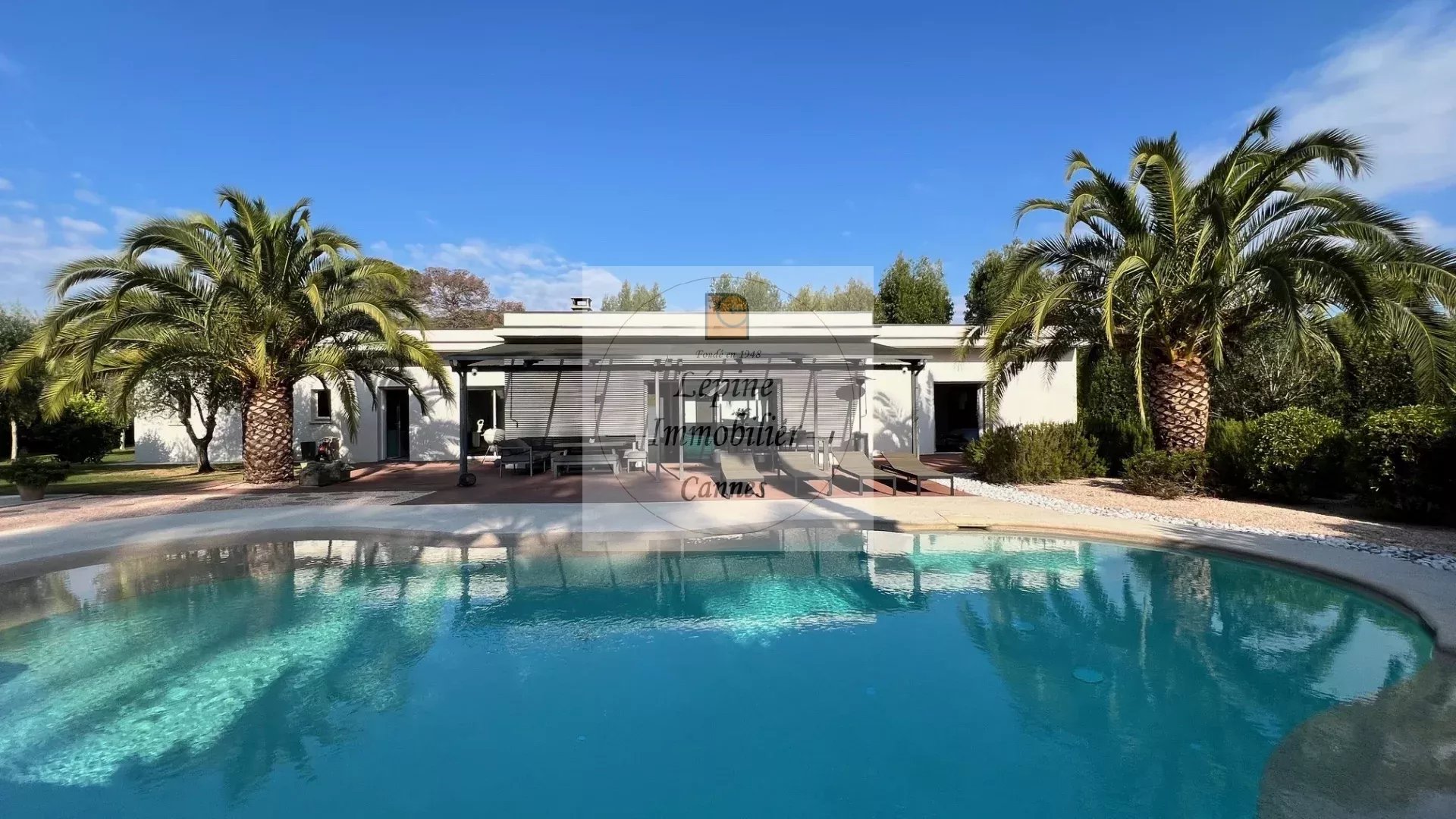 MOUGINS : Située dans un quartier résidentiel de MOUGINS, à quelques minutes de CANNES et à proximité de l'étang de FONTMERLE, Superbe villa de plain-pied à l'architecture moderne et épurée sur terrain plat de 2416 m².