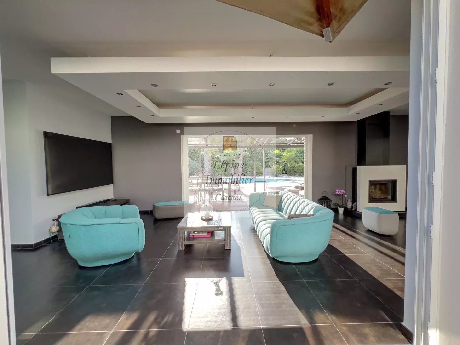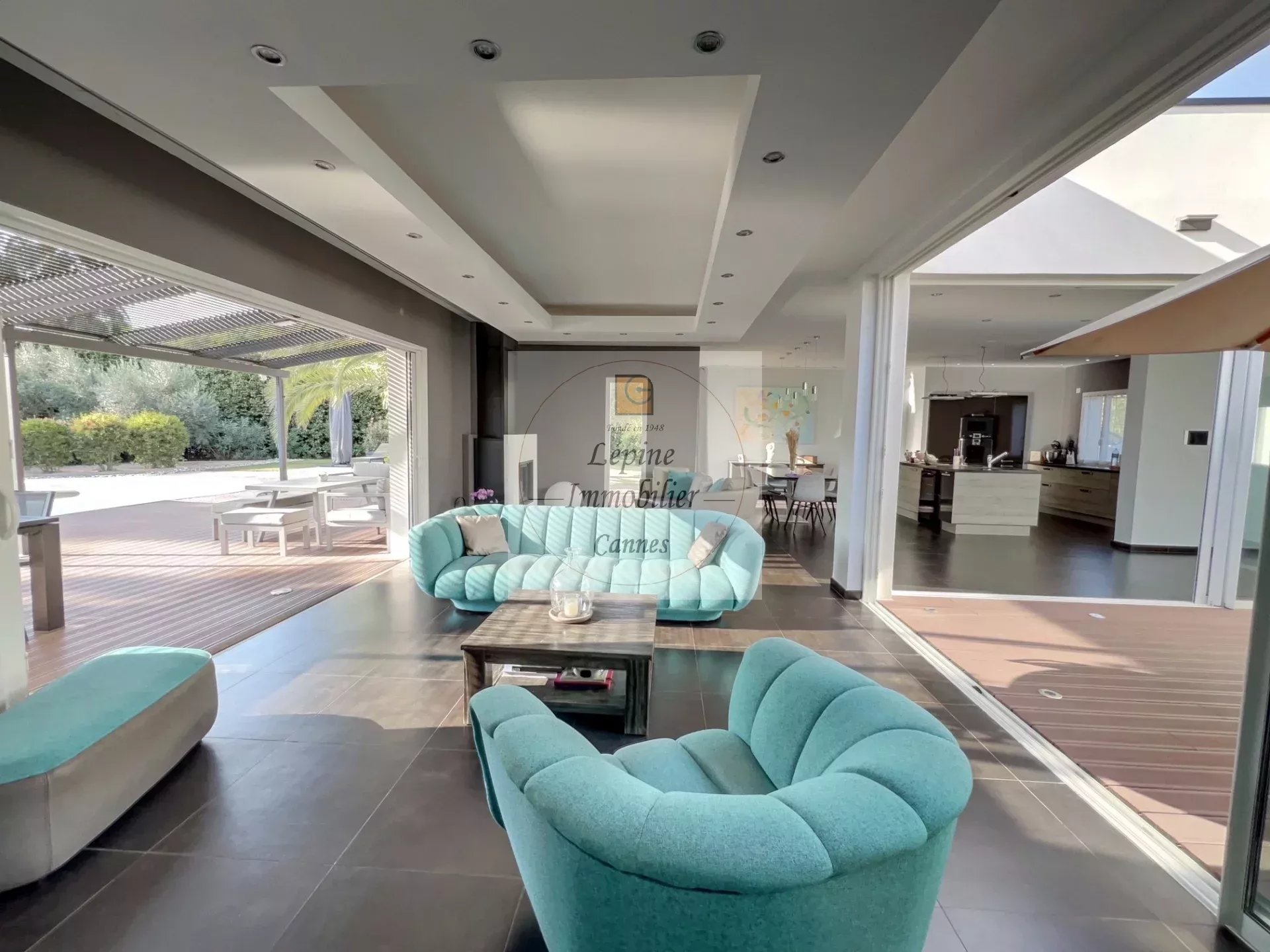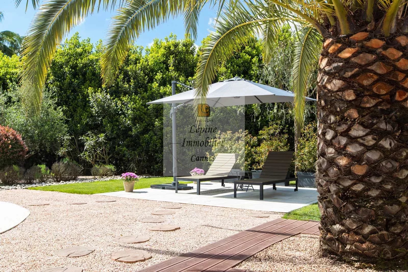 MOUGINS : Située dans un quartier résidentiel de MOUGINS, à quelques minutes de CANNES et à proximité de l'étang de FONTMERLE, Superbe villa de plain-pied à l'architecture moderne et épurée sur terrain plat de 2416 m².