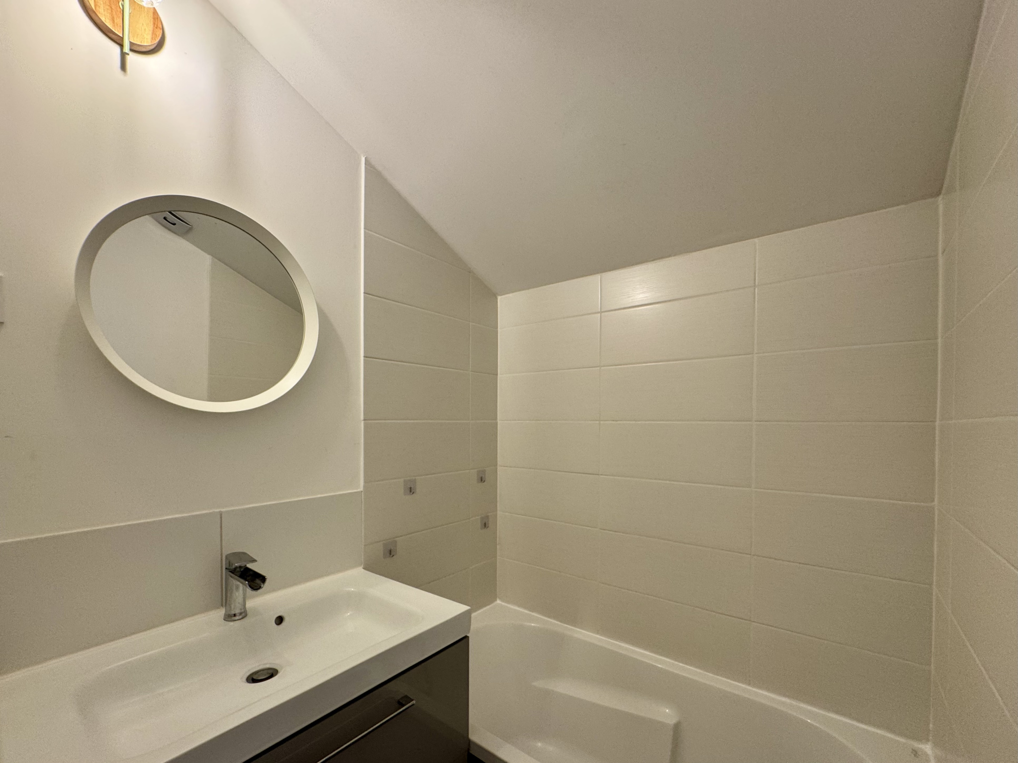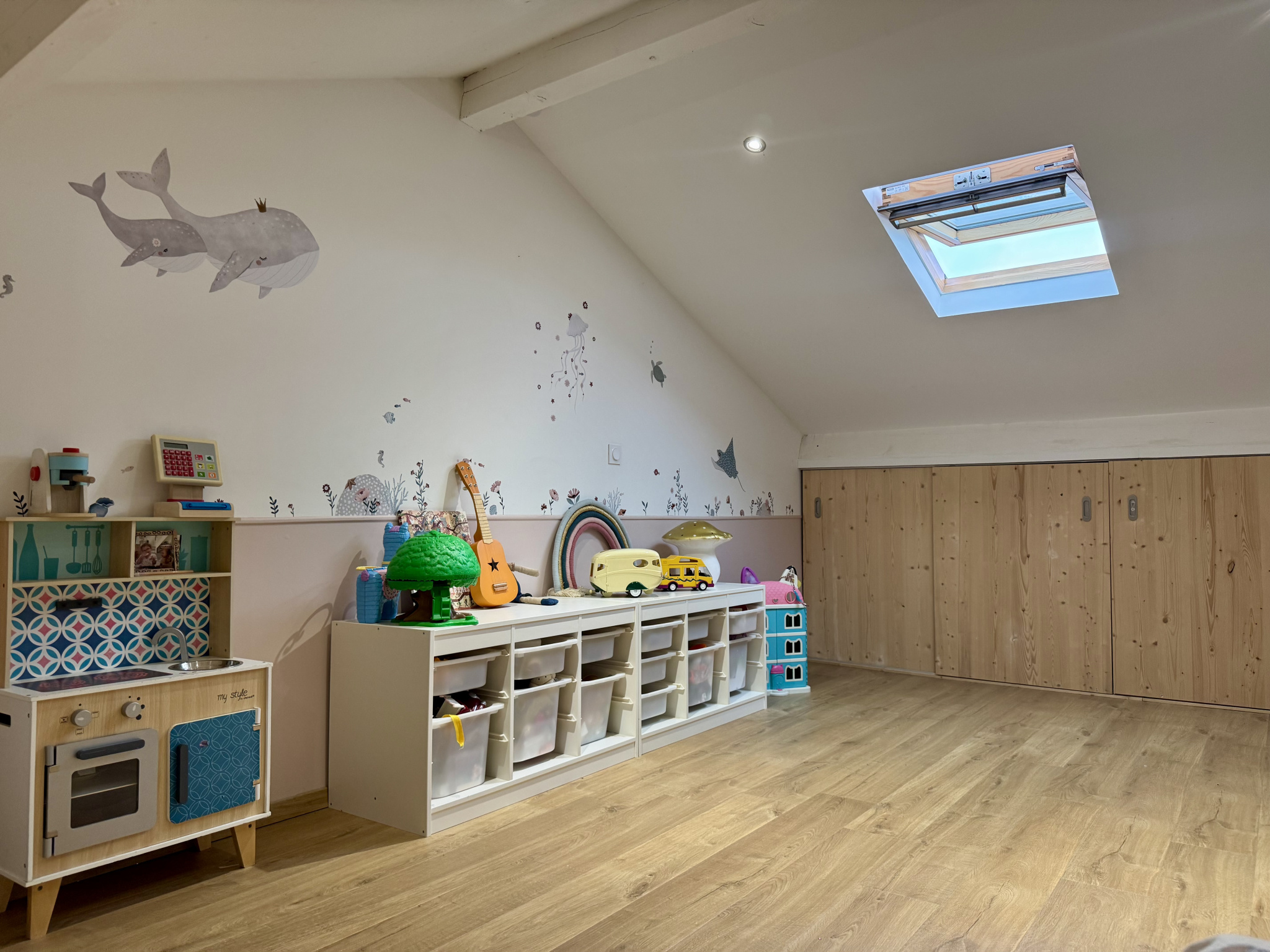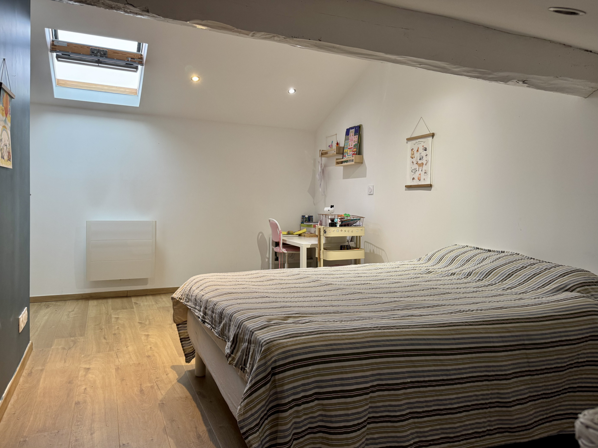 À l'étage, un bel escalier mène à deux chambres mansardées spacieuses, accompagnées d'une salle de bain.