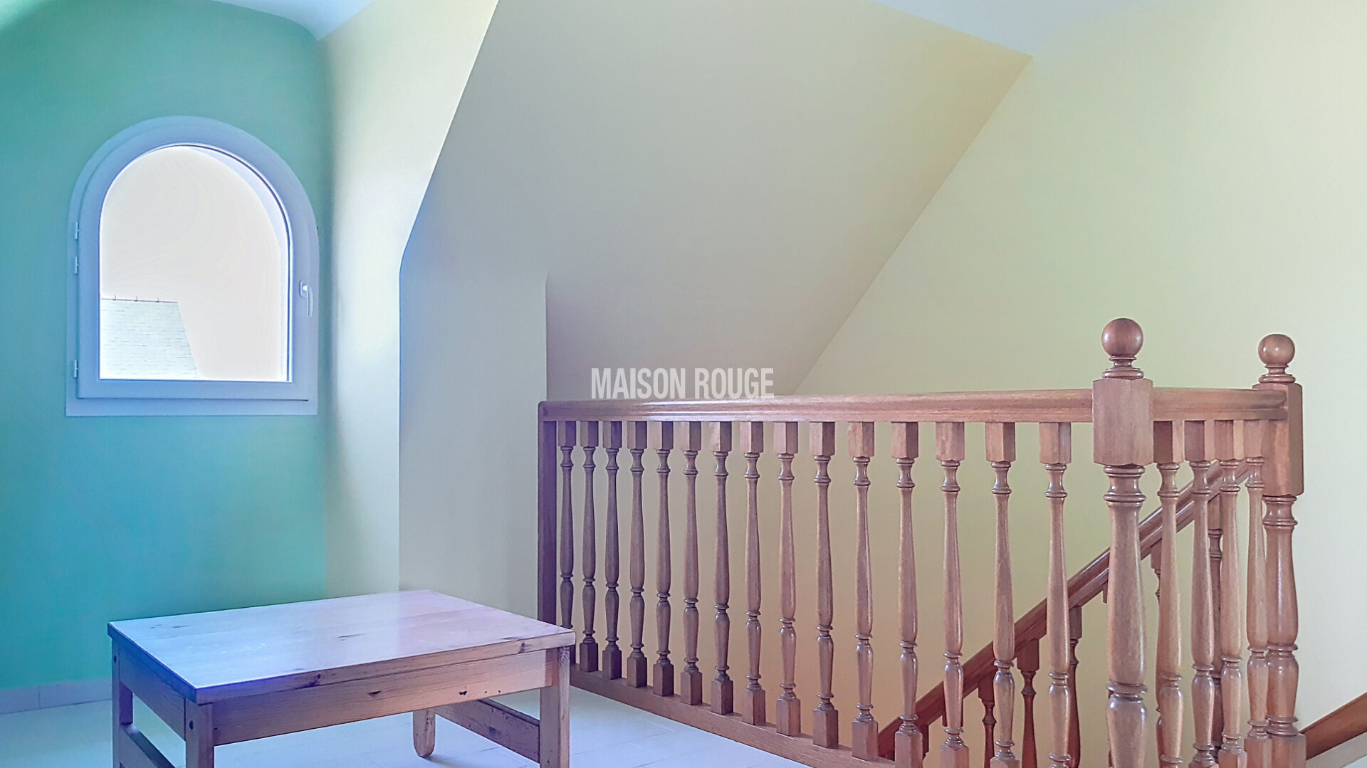 À l'étage, un large escalier en bois mène à une mezzanine desservant trois grandes chambres lumineuses ainsi qu'une vaste pièce offrant un potentiel d'aménagement supplémentaire. Une salle de bains ainsi qu'un second WC indépendant complètent ce niveau.