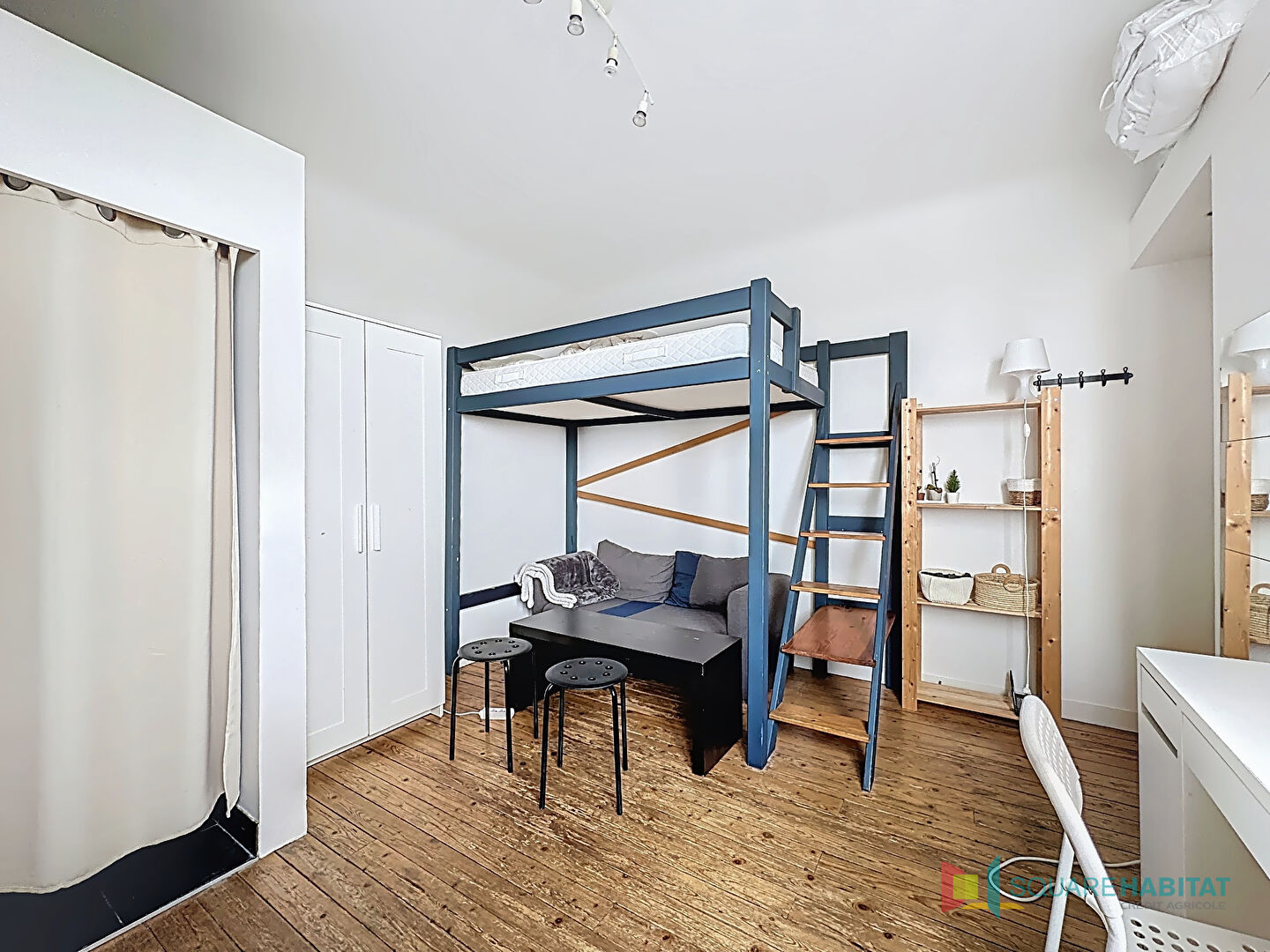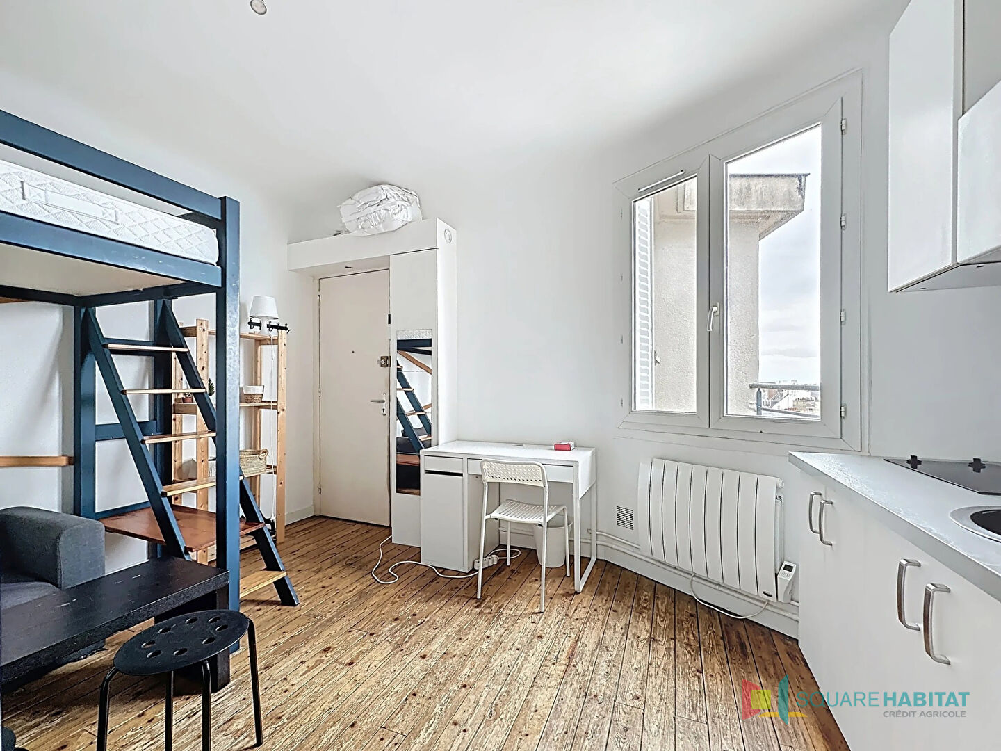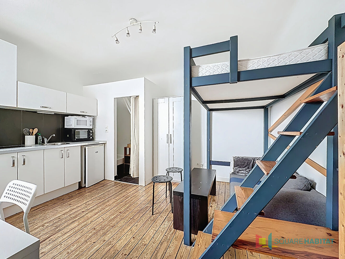 Au 6e et dernier étage avec ascenseur (jusqu'au 5e), pièce de vie exposée Ouest avec vue dégagée sur RENNES, qui comprend un espace cuisine, un coin nuit avec lit mezzanine, salle d'eau avec lavabo et W.C. sur le palier attenant.