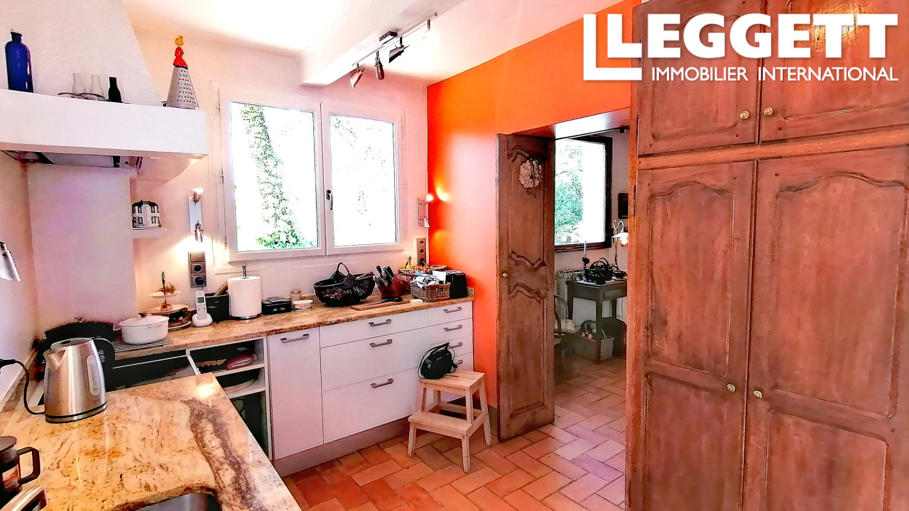 Avec 135 m² de surface établie sur rez de chaussée, rez de jardin et 1er étage, ceinturée par deux larges terrasses Nord et Sud, au sein d'un jardin paysager et boisé de 10 000 m², elle allie de beaux matériaux, offre tout confort et présente de belles prestations telles qu'une belle cheminée foyer ouvert, magnifique escalier en colimaçon signé Eiffel. La maison dispose de beaux volumes dont un large séjour ouvrant sur une généreuse cuisine équipée, de quatre chambres, dont deux en rez de jardin accessibles par la véranda attenante.