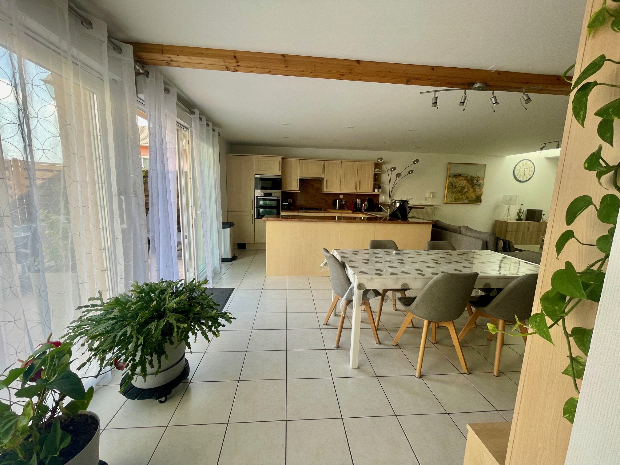 Au rez de chaussée : entrée avec placards, cuisine équipée integrée ouverte sur salon séjour, buanderie, wc suspendu, garage 1 véhicule motorisé avec espace grenier.