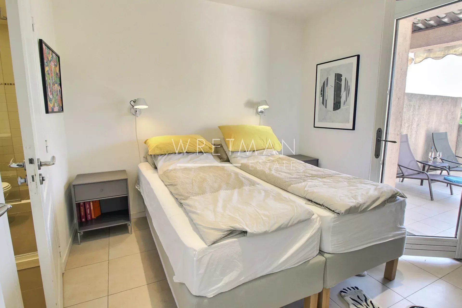 D’une surface d’environ 62 m², l’appartement comprend un séjour lumineux avec une cuisine ouverte, donnant sur une généreuse terrasse de 31 m² — idéale pour les repas en plein air ou la détente au soleil, tout en profitant d’une vue sur la Méditerranée et la verdure environnante. Vous trouverez ensuite deux chambres confortables, chacune avec un accès direct à la terrasse. L’une dispose d’une salle de bains attenante avec WC, l’autre d’une salle d’eau avec WC.