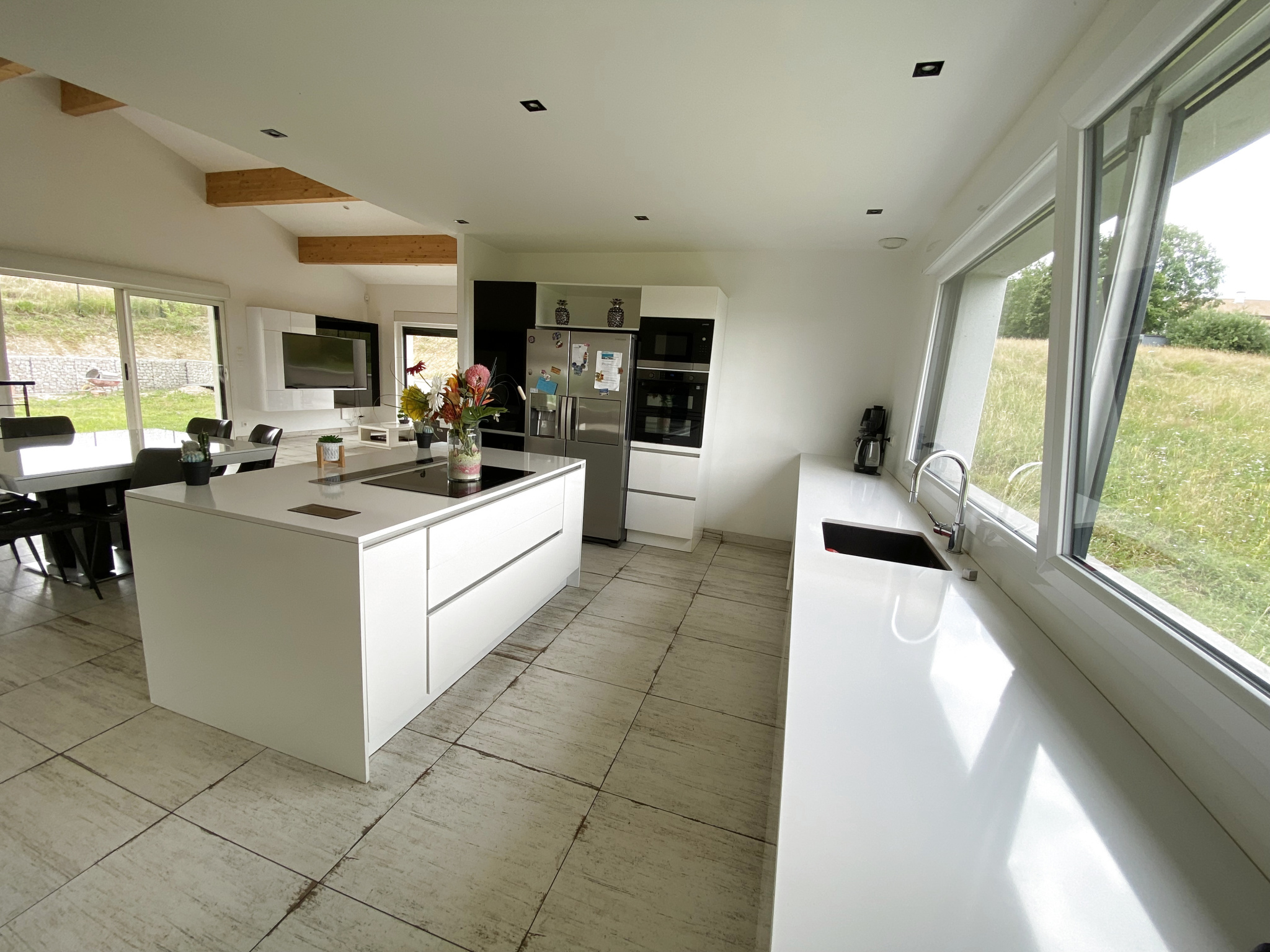 MACON Sur la commune de SANCE, maison d'architecte très atypique , 186 m2 surface habitable,3 belles terrasses de 200 m2 - Possibilité de construire une piscine devant la terrasse - Grande cour- parking clos par un mur, double garages , en rdc un bureau avec sanitaire de 13 m2 avec une entrée individuelle - Au 1er étage : une suite parentale avec salle d'eau équipée avec baignoire et douche italienne, dressing, wc séparé - 3 autres chambres 11,38 m2, 12,15 m2, 12,48 m2 avec accès à une terrasse de 45 m2 -Une salle de bain de 7 m2 avec douche et baignoire , wc suspendu - Une vue panoramique depuis la pièce à vivre de 75 m2 avec accés à un pool house pour installer un futur jacuzzi, une cuisine équipée spacieuse avec cellier et wc séparé, - Construction traditionnelle de 2017, chauffage au sol avec pompe à chaleur, excellent DPE B/A, huisseries en alu gris antracite, toiture avec tuiles mécaniques ardoisées, hors lotissement - Des travaux en extérieur seront terminés par le propriétaire, cour, façade des murets - Mandat 442 Les honoraires sont à la charge du vendeur - Vous trouverez sur la commune de Sancé toutes les commodités, écoles, zone commerciale, transports scolaires, proche des entrées d'autoroutes A6/A40/A406, gare Mâcon où gare TGV Loché - Pour plus de renseignements contactez : Evelyne 06.08.49.64.59 ou mail evelyne@ethimmologis.com -Les informations sur les risques auxquels ce bien est exposé sont disponibles sur le site www.géorisques.gouv.fr