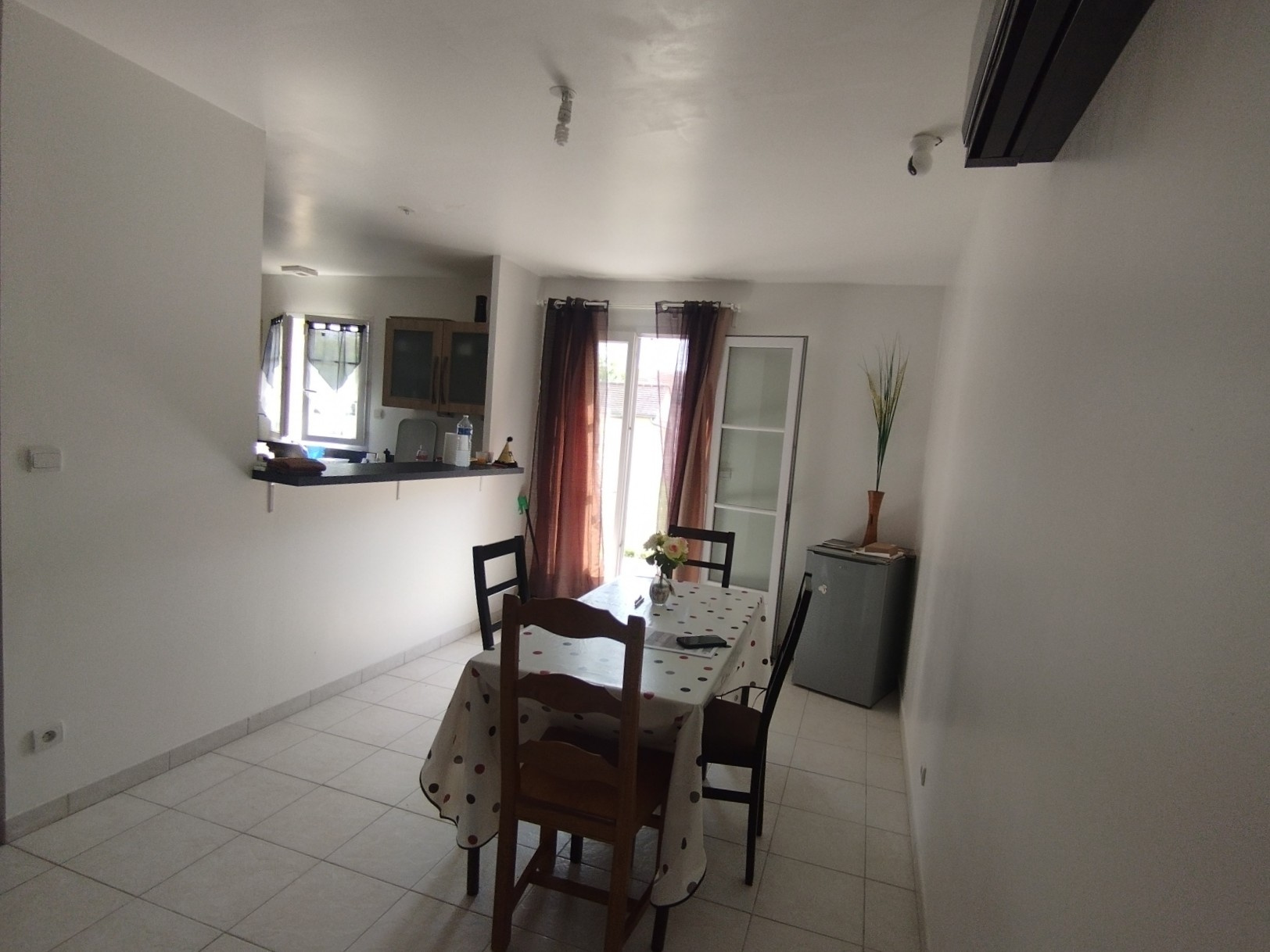 Cuisine aménagée et équipée avec passe-plat.