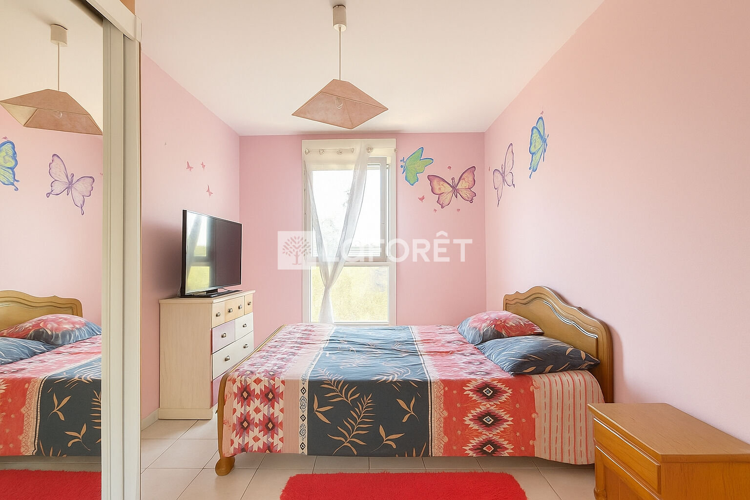 Au 1er étage, 2 belles chambres avec placard et climatisation, une salle de bains avec fenêtre. L'ensemble est calme et bien distribué . On accède par la baie vitrée à une terrasse fermée avec une pergola en bois. Pas de voisin au dessus, environnement très calme. 1 place de parking dédiée et sécurisée au pied de l'appartement.