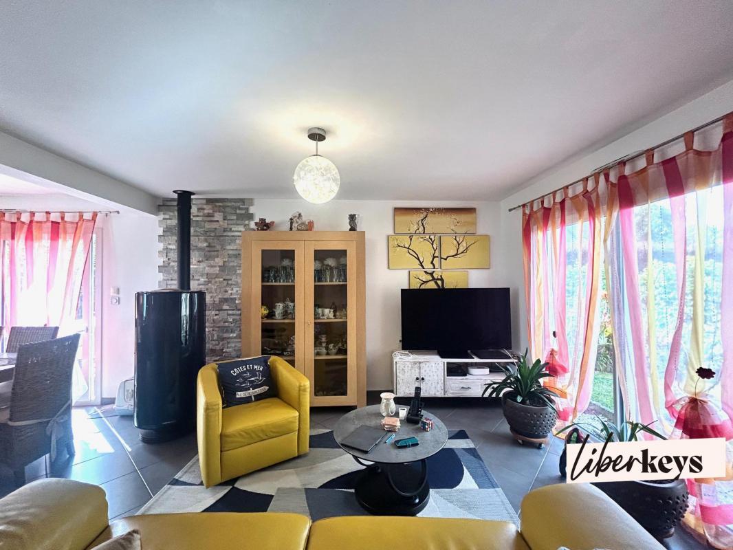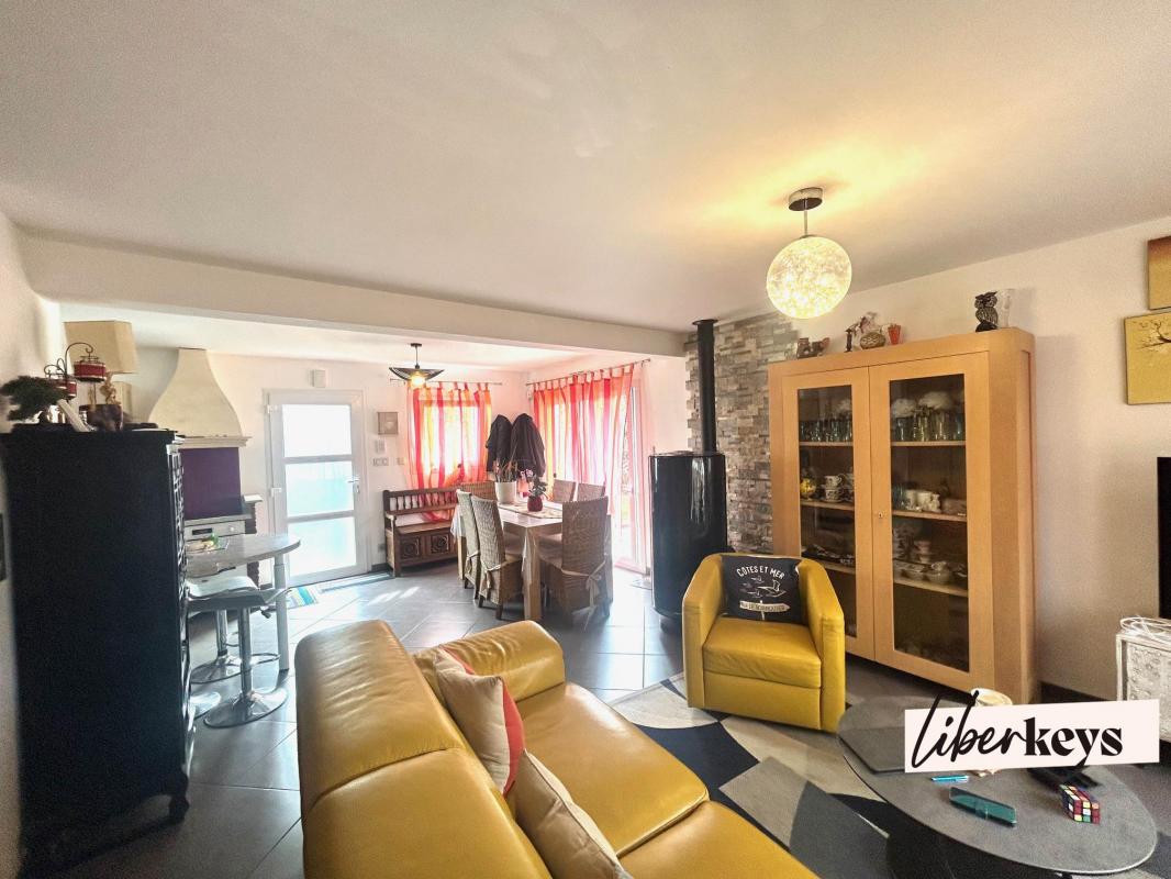 Au rez-de-chaussée, une entrée donnant sur un séjour salon lumineux, agrémenté d'un poêle à granulés (février 2025), une cuisine aménagée et équipée ouverte sur la pièce de vie avec cellier attenant.