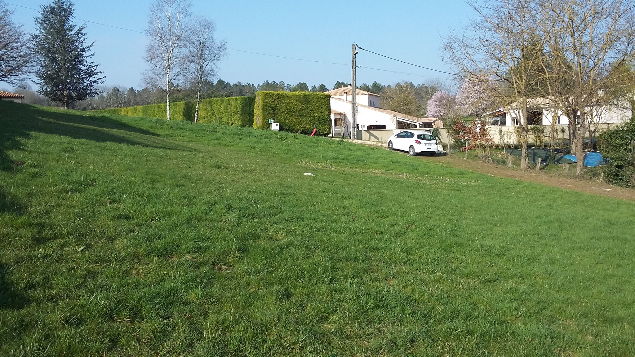 Possibilité d'acquérir en supplément un autre terrain de 1091 m2 (dont 771 m2 constructibles), attenant à cette parcelle de 910 m2. L'ensemble ferait un terrain unique de 2001 m2 au total, dont 1681 m2 seraient constructibles. Ces 771 m2 supplémentaires sont moins en pente, ce qui donnerait la possibilité d'y construire une maison de plain-pied.