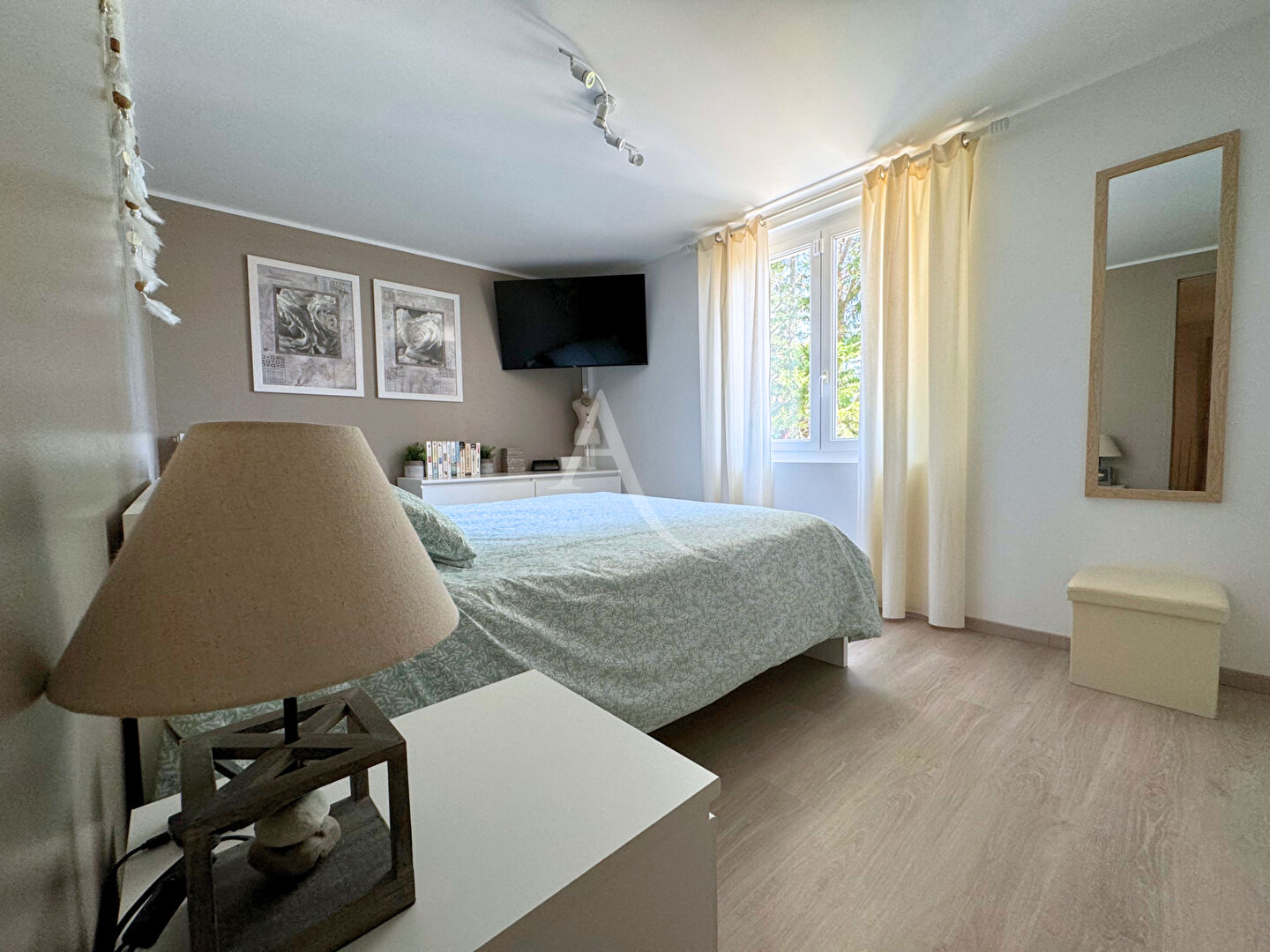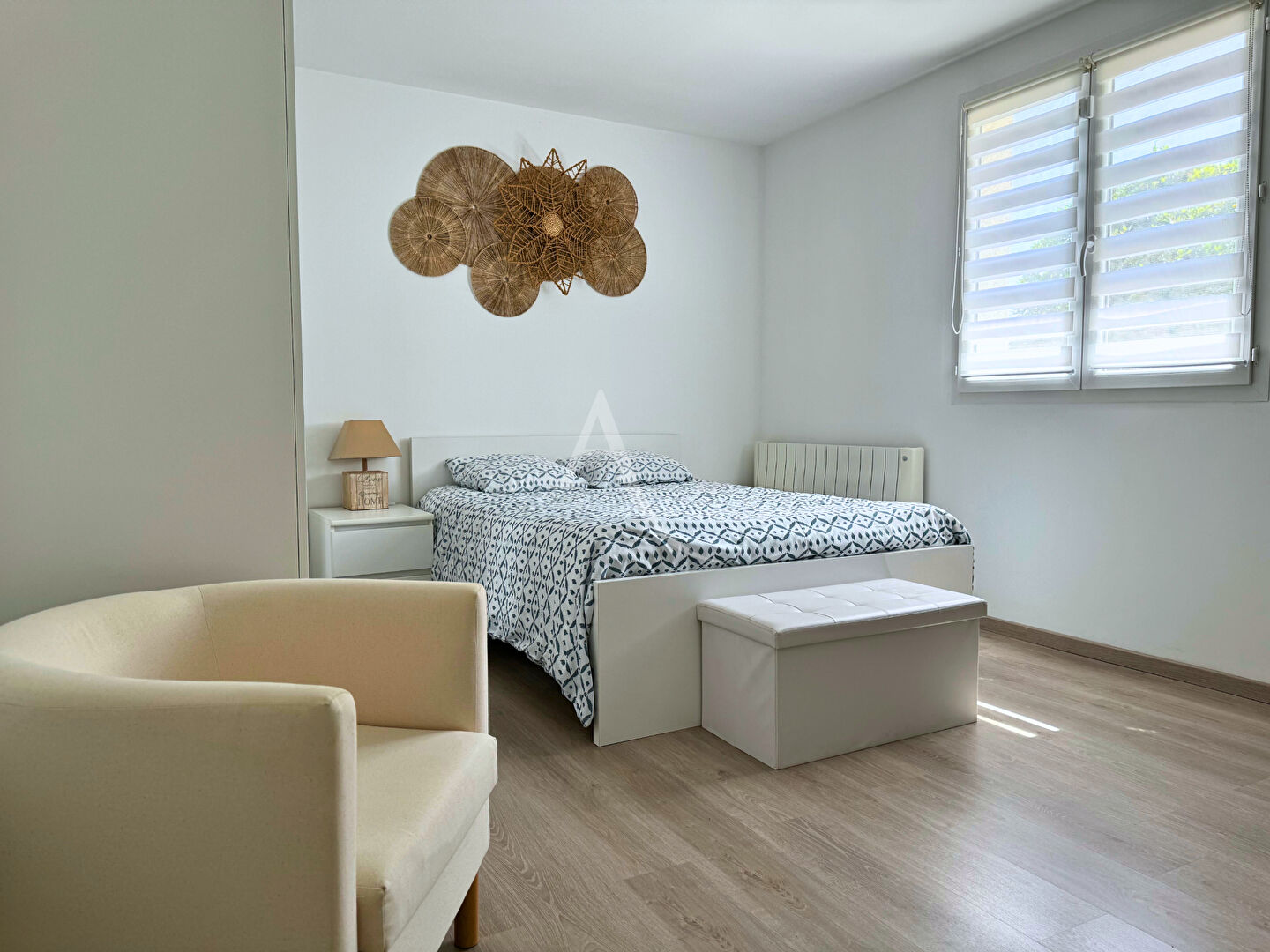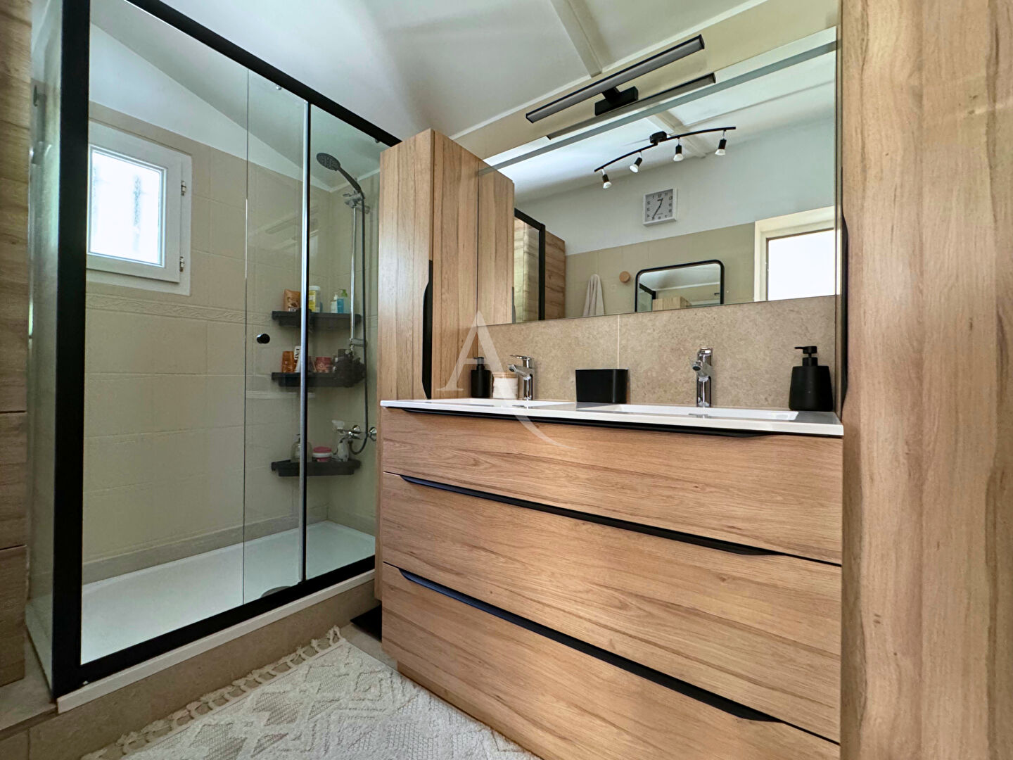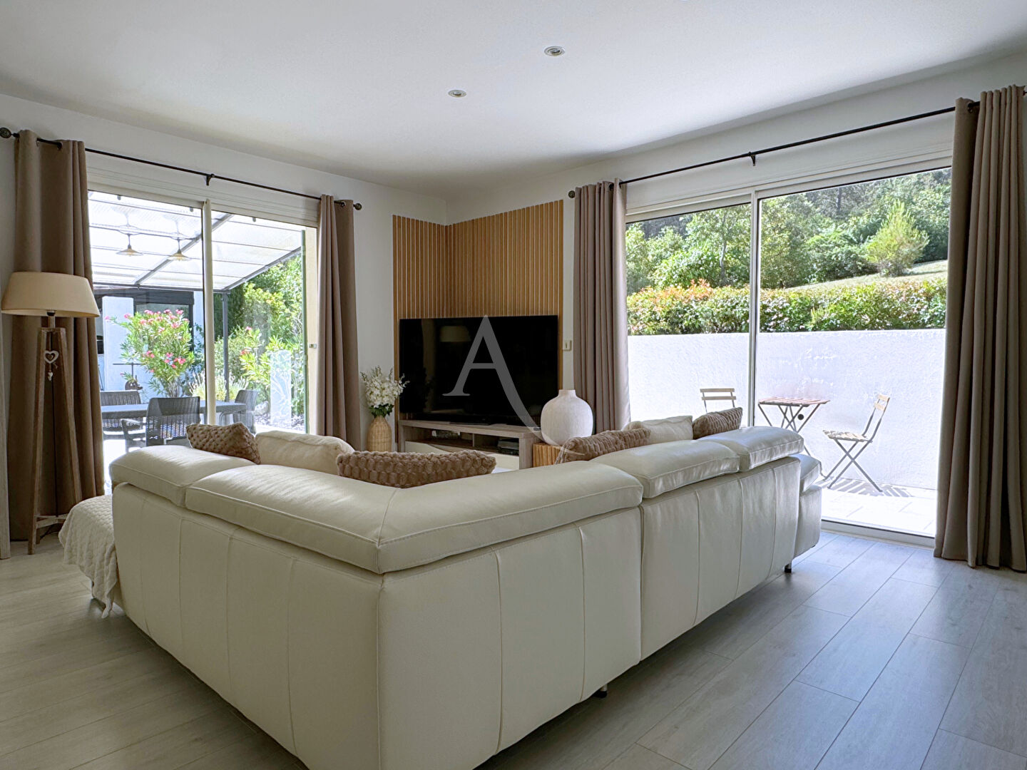 L'accès à la propriété se fait par un portail automatique laissant découvrir un jardin méditerranéen, facile d'entretien, dans lequel on chemine jusqu'à la grande terrasse ensoleillée et le perron de la bâtisse. Cette dernière, entièrement rénovée, dispose d'une belle entrée, d'un séjour lumineux ouvrant sur l'extérieur, d'une cuisine équipée fonctionnelle, de trois chambres dont une suite avec un immense dressing, d'un cellier très utile, d'une buanderie, d'une salle de douche et de W.C. séparés. Un garage et un carport deux places viennent compléter l'ensemble.