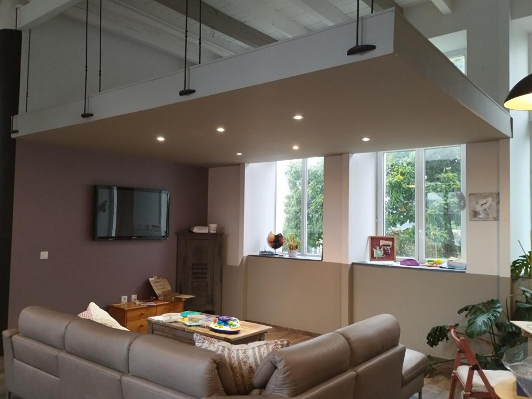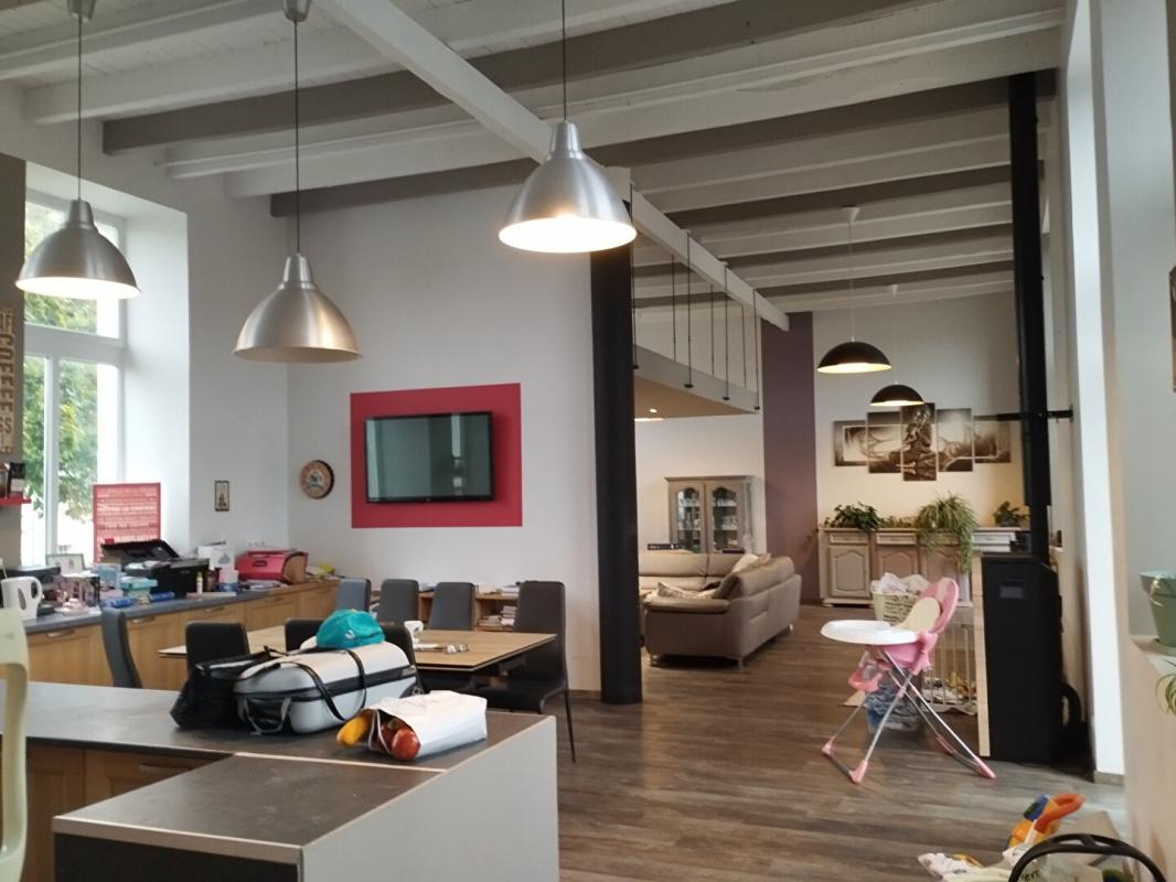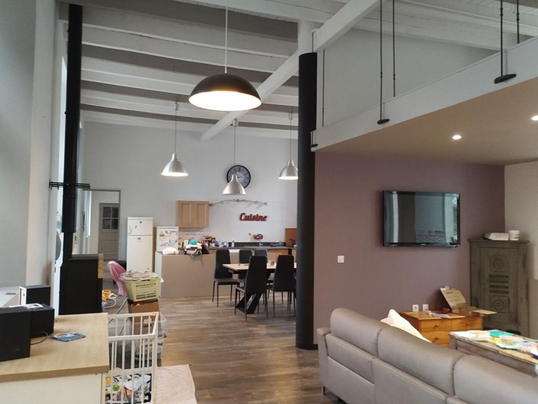 ancienne école lumineuse entièrement rénovée avec goût dont la répartition est la suivante : au RDC : entrée avec dressing, cuisine aménagée et equipée ouverte sur salle à manger-salon de 80 M2, 2 suites parentales avec chacune sa salle d'eau et son wc dont une avec mezzanine de 25 M2, wc séparé, accès à la cave buanderie, chaufferie :