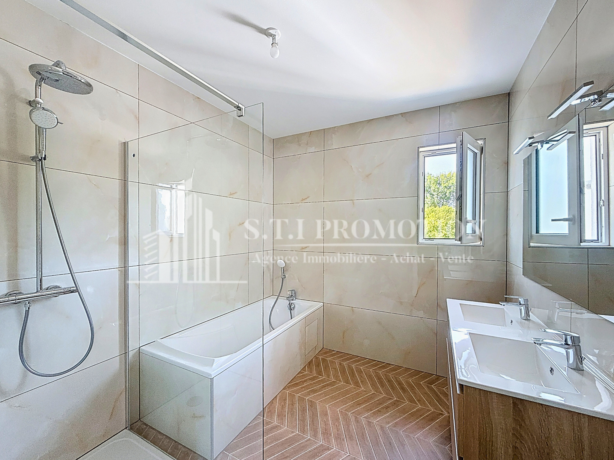 L'espace nuit propose deux chambres élégantes, dont une avec coin dressing sur mesure, ainsi qu'une salle de bain moderne dotée de douche et baignoire, et d'un meuble double vasques haut de gamme, pensée pour allier confort et raffinement au quotidien. Les WC séparés avec lave-mains complètent l'agencement de manière fonctionnelle.