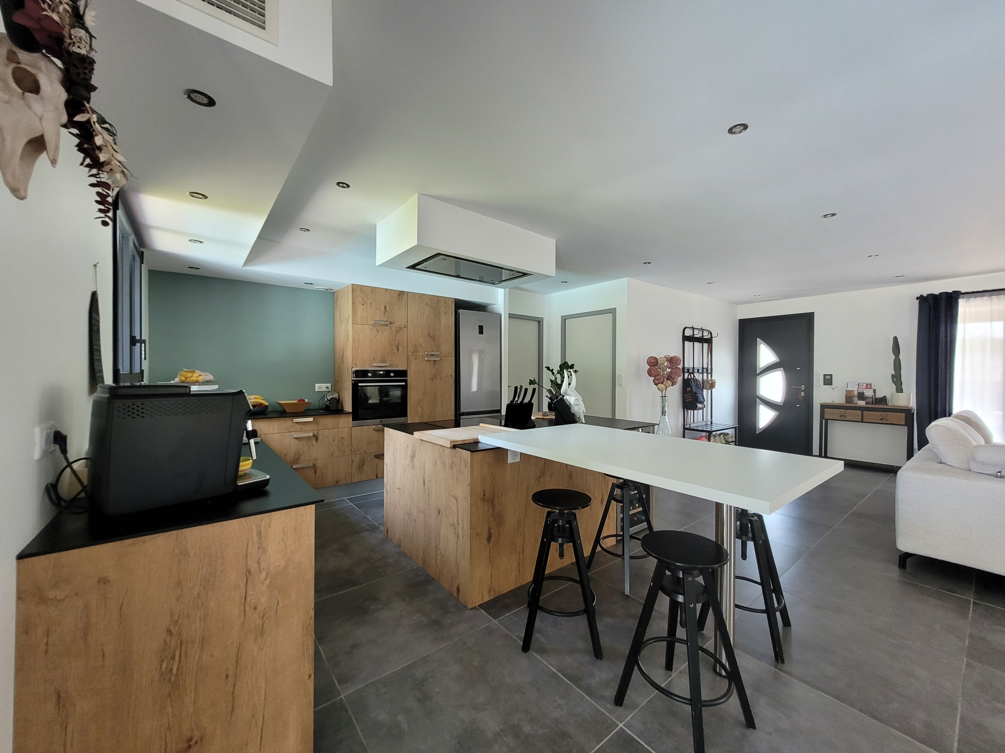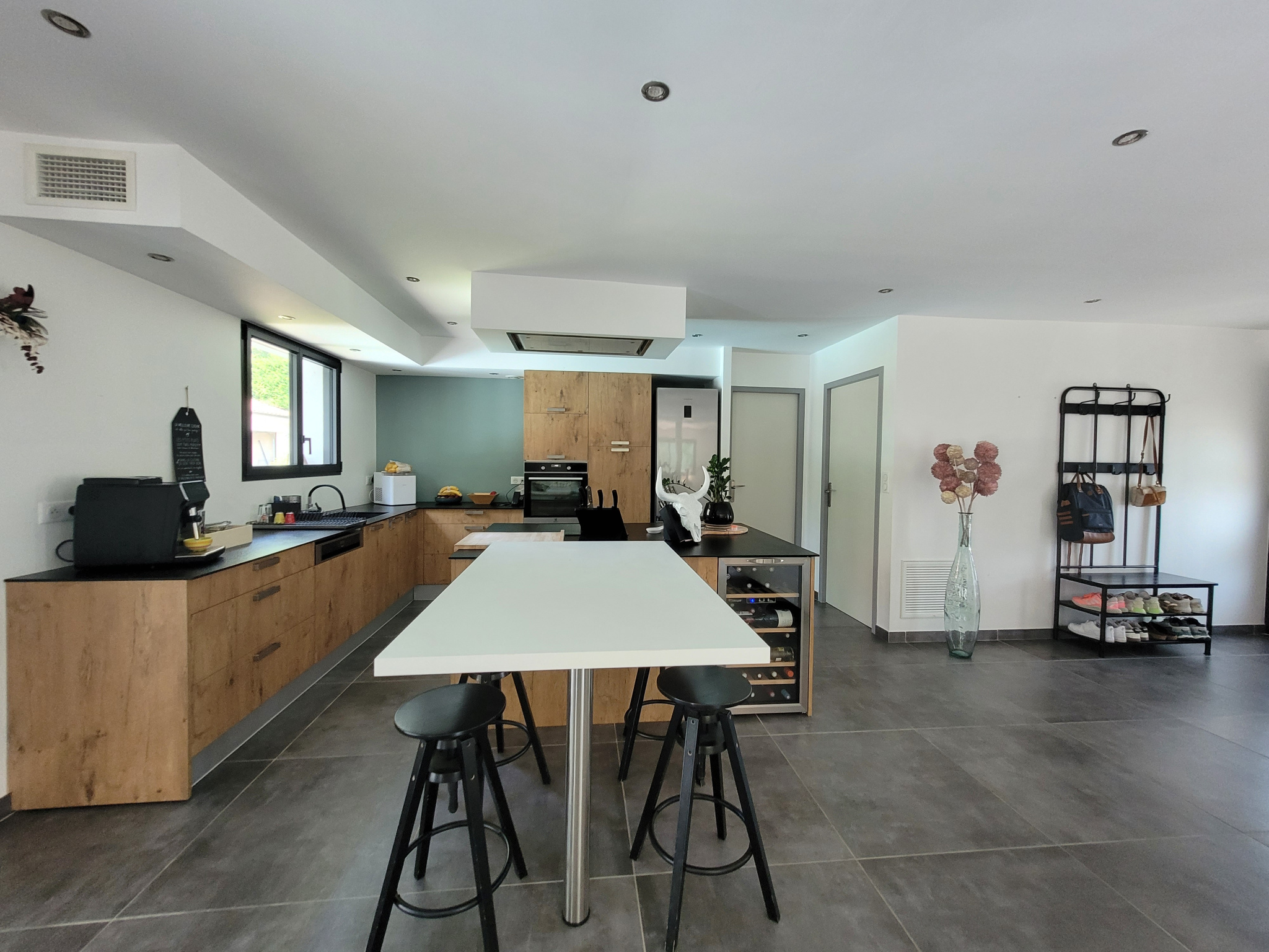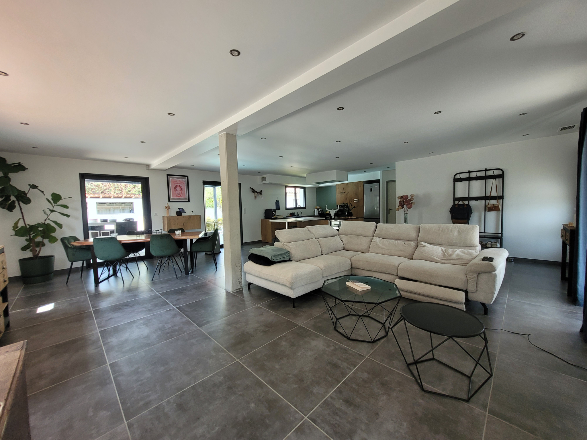 L'entrée s'ouvre sur la pièce de vie de 70 m2 lumineuse grâce à ses nombreuses ouvertures.