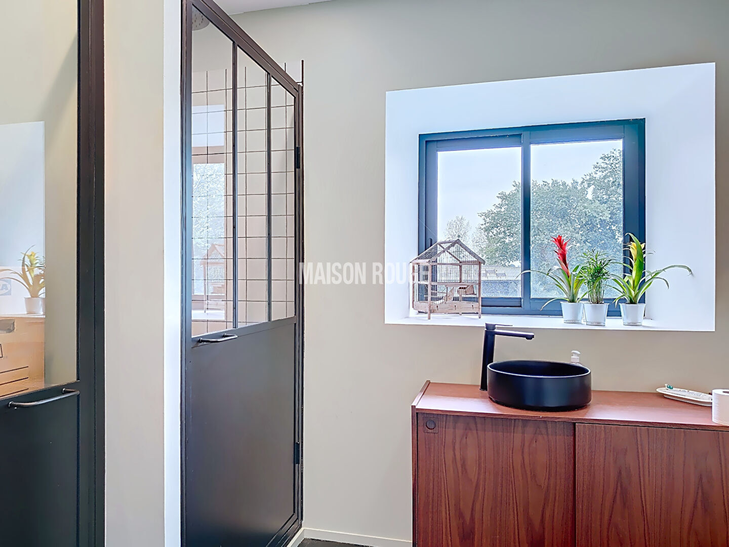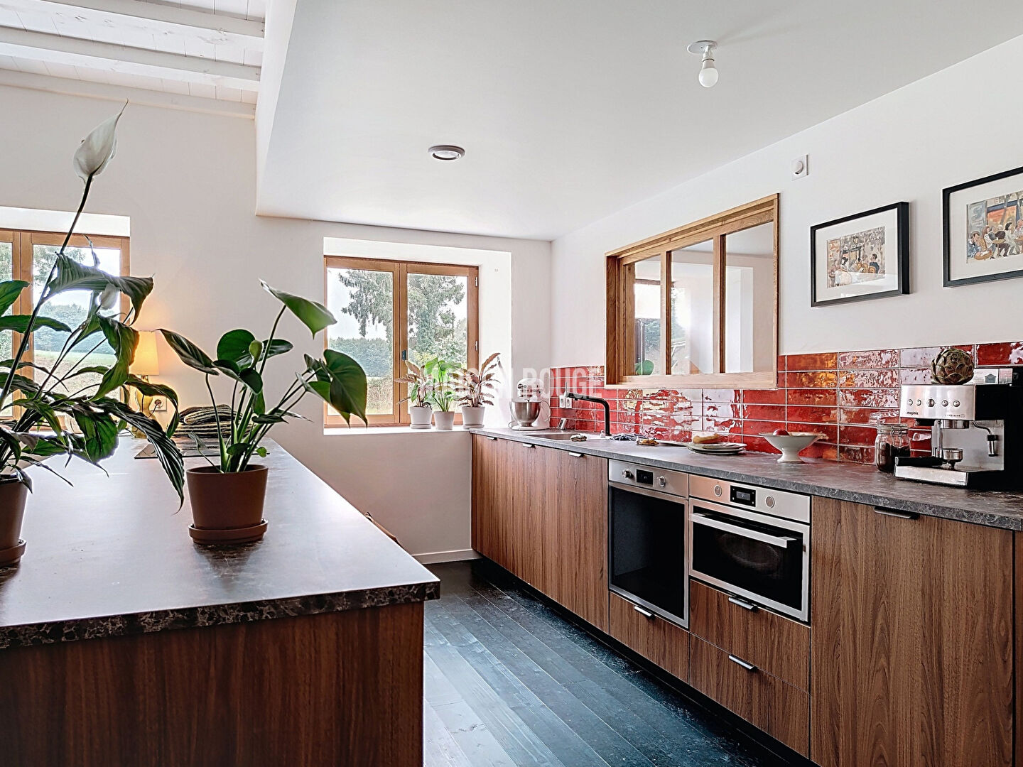 spacieuse pièce à vivre de 50 m² avec sa cuisine ouverte neuve et un chaleureux poêle à bois. huisseries changées.