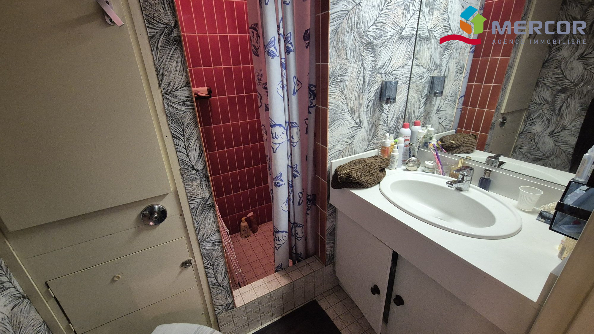 L'appartement se compose : d'une entrée avec cuisine équipée, d'un séjour avec placard donnant accès à la terrasse, d'une chambre cabine (possibilité lit 1,4 m x 1,90 m), une salle de bains avec douche et wc.