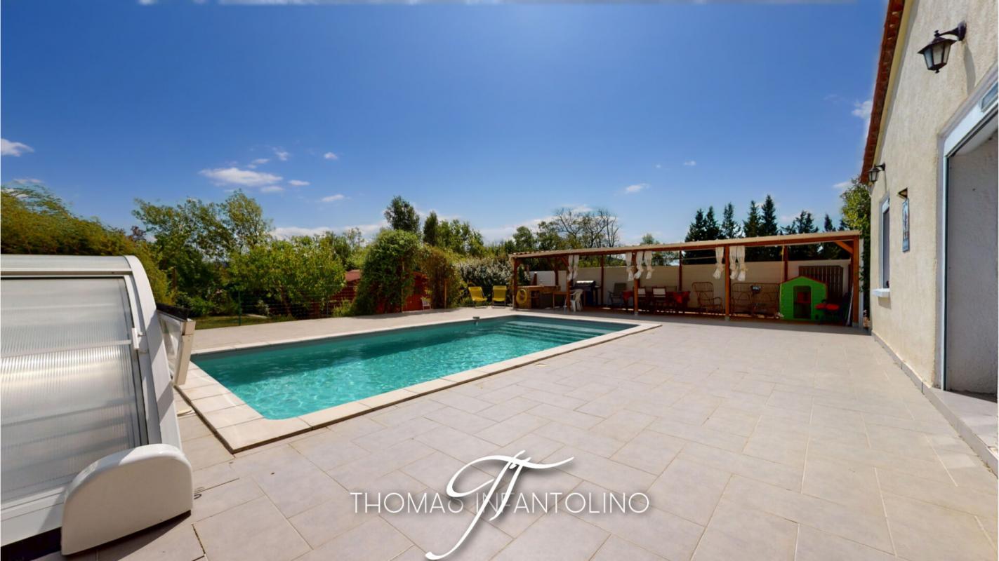 Enfin, au fond du jardin, vous découvrirez un spacieux chalet en bois, idéal pour le stockage ou l'aménagement d'un atelier. La terrasse, côté piscine, est agrémentée d'un espace extérieur aménagé en cuisine d'été, parfait pour partager des repas conviviaux en plein air.