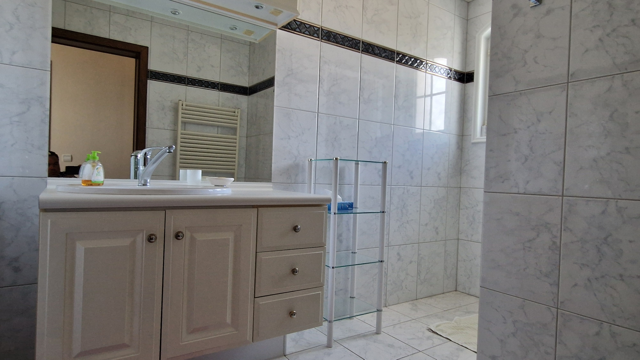 La maison se composant au RDC: d'un grand hall d'entrée, d'un salon / salle à manger d'environ 50m2, d'une grande cuisine avec plan de travail en marbre, d'une chambre de 16m2, d'une grande salle de bains, d'un wc, d'un cellier et d'une buanderie - Au 1er étage: de deux grandes chambres de 16m2, d'une salle d'eau, d'un wc, d'un dégagement avec coin bureau et d'une terrasse