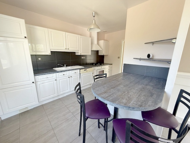 Cuisine ouverte : spacieuse, donnant sur un salon lumineux, équipé d'une cheminée qui ajoute une touche chaleureuse à l'espace.