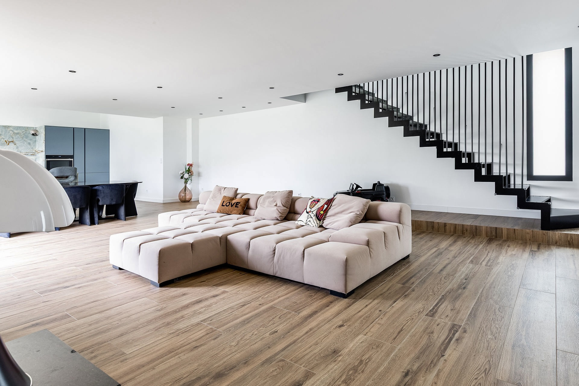 Dès l'entrée, vous serez séduits par une vaste pièce de vie de plus de 90 m2, baignée de lumière grâce à ses baies vitrées en aluminium qui ouvrent l'espace sur l'extérieur. Le vaste séjour s'accompagne d'un véritable chef-d'oeuvre : un escalier sur mesure, pensé comme une pièce de décoration à part entière, qui accentue l'esprit contemporain et donne un caractère unique à la maison. Dans le prolongement, la cuisine en marbre sur mesure s'impose comme un espace d'exception. Entièrement équipée et conçue dans les moindres détails, elle se distingue par son îlot central, alliance parfaite de design et d'élégance.
