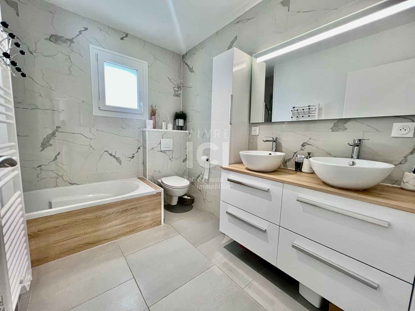 L'espace nuit se compose de deux chambres avec rangements, d'une salle de bains avec double vasque, baignoire et WC, et d'une suite parentale disposant d'un dressing, d'une salle d'eau privative et d'un accès direct à l'extérieur.