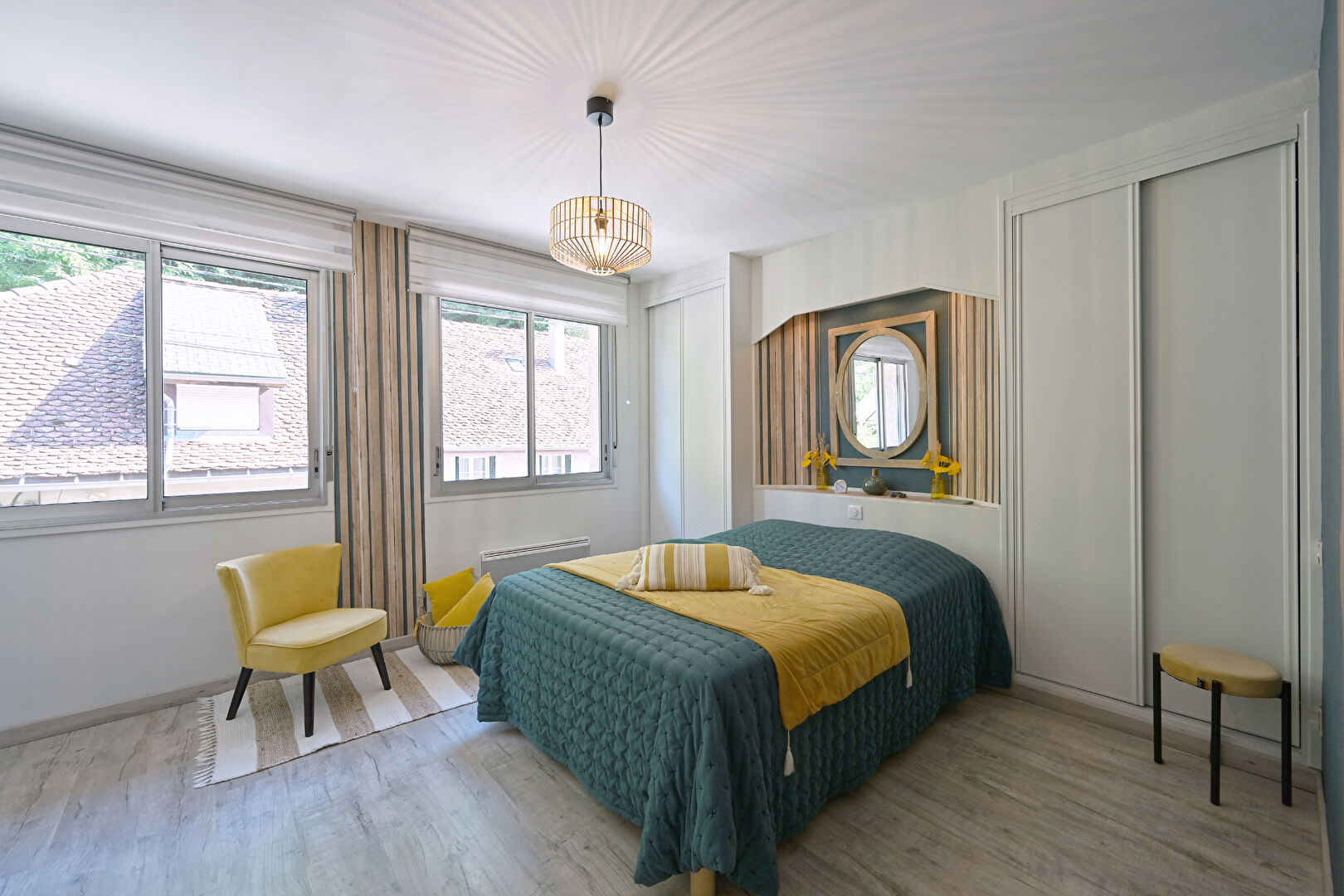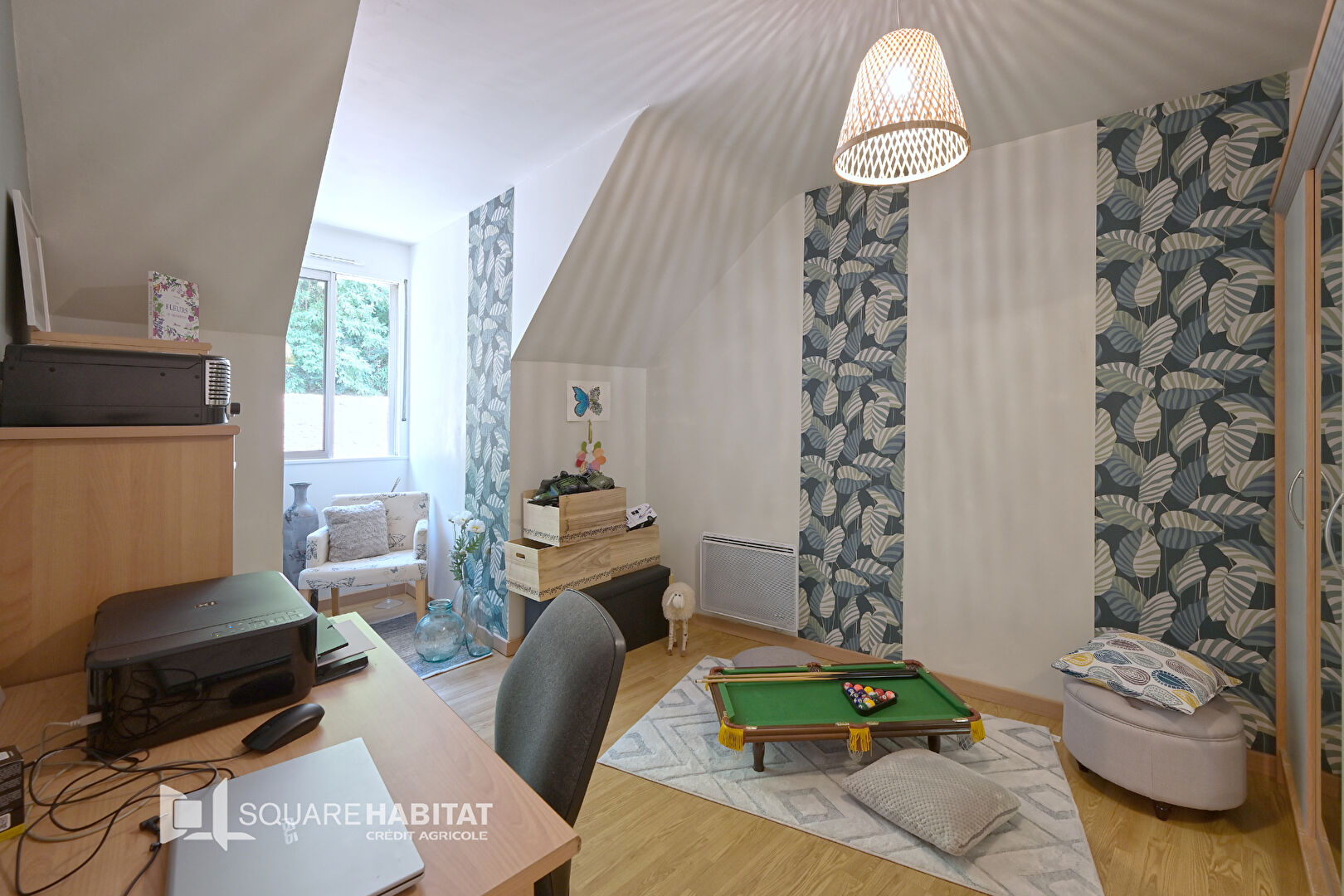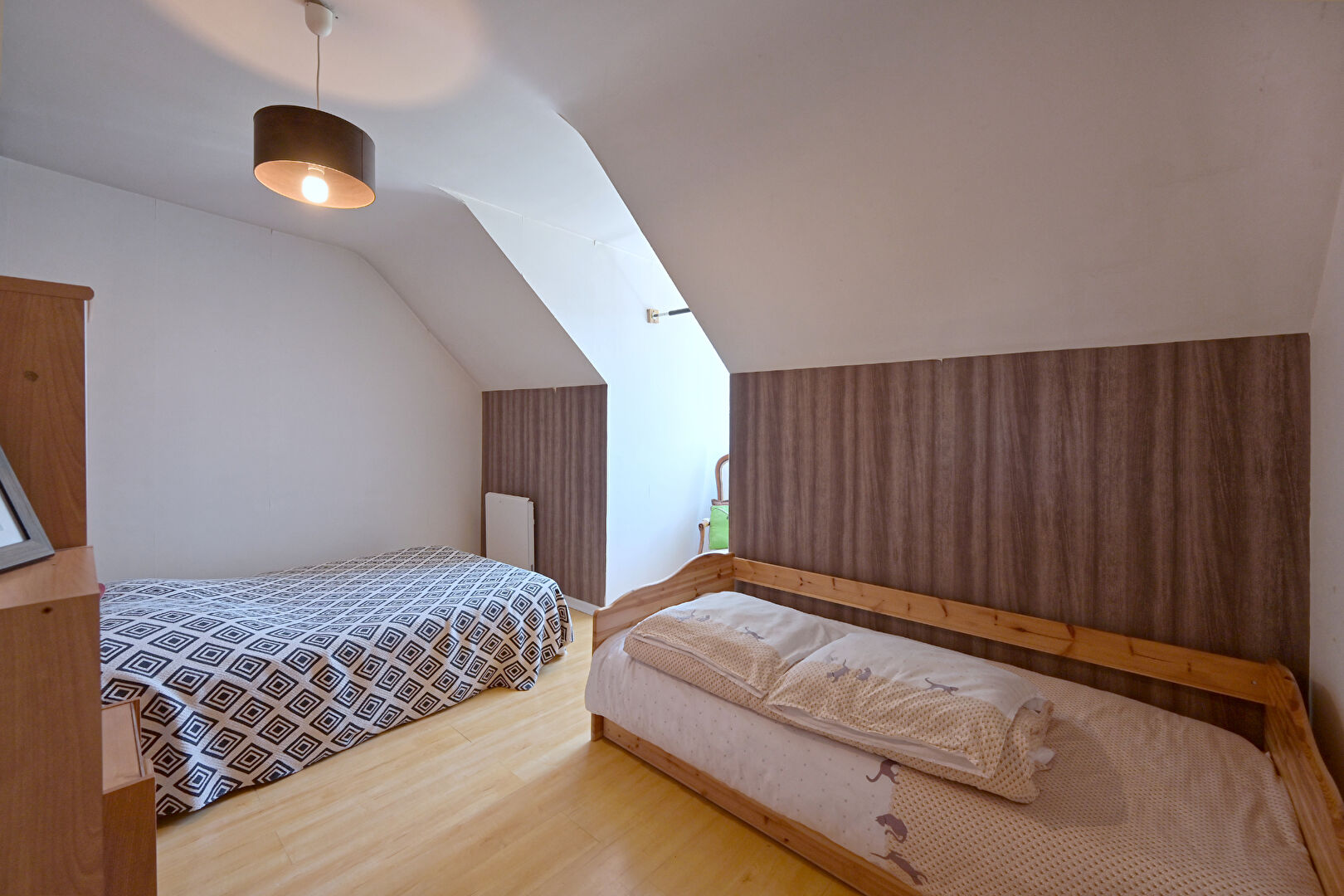 À l'étage supérieur, vous trouverez deux chambres accompagnées d'une salle de bains équipée d'une douche et d'une baignoire. De plus, cet appartement offre de nombreux espaces de rangement et des charges de copropriété peu élevées.