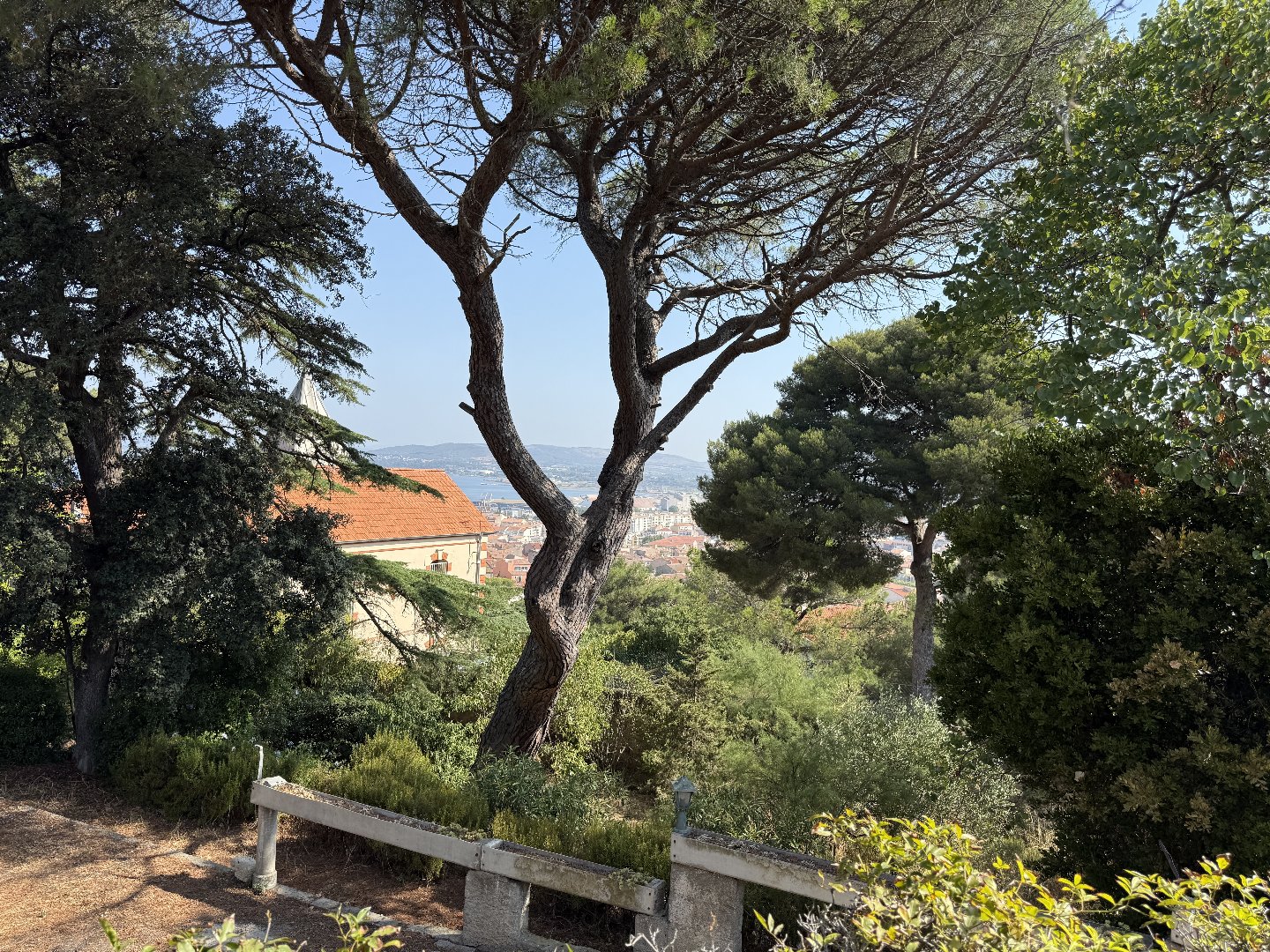 Le terrain, clos de murs en pierres sèches, est agrémenté de cèdres et de pins plantés lors de la construction.