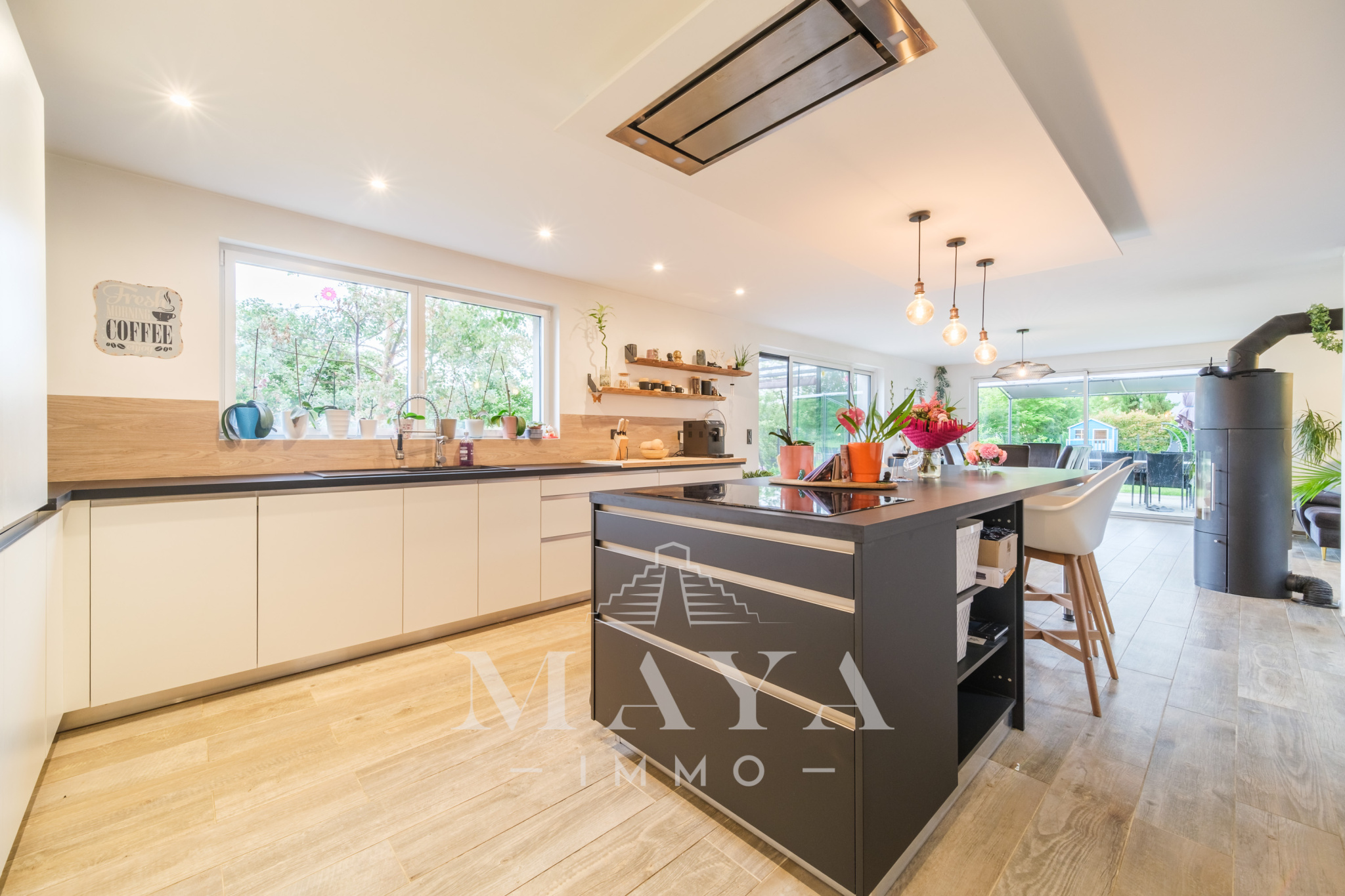 Au rez-de-chaussée, une entrée avec rangement, une salle d'eau avec WC, un espace de vie lumineux de 55m2 comprenant une grande cuisine équipée, un salon/séjour avec poêle à bois ouvert sur l'extérieur, un cellier et l'accès au garage double.