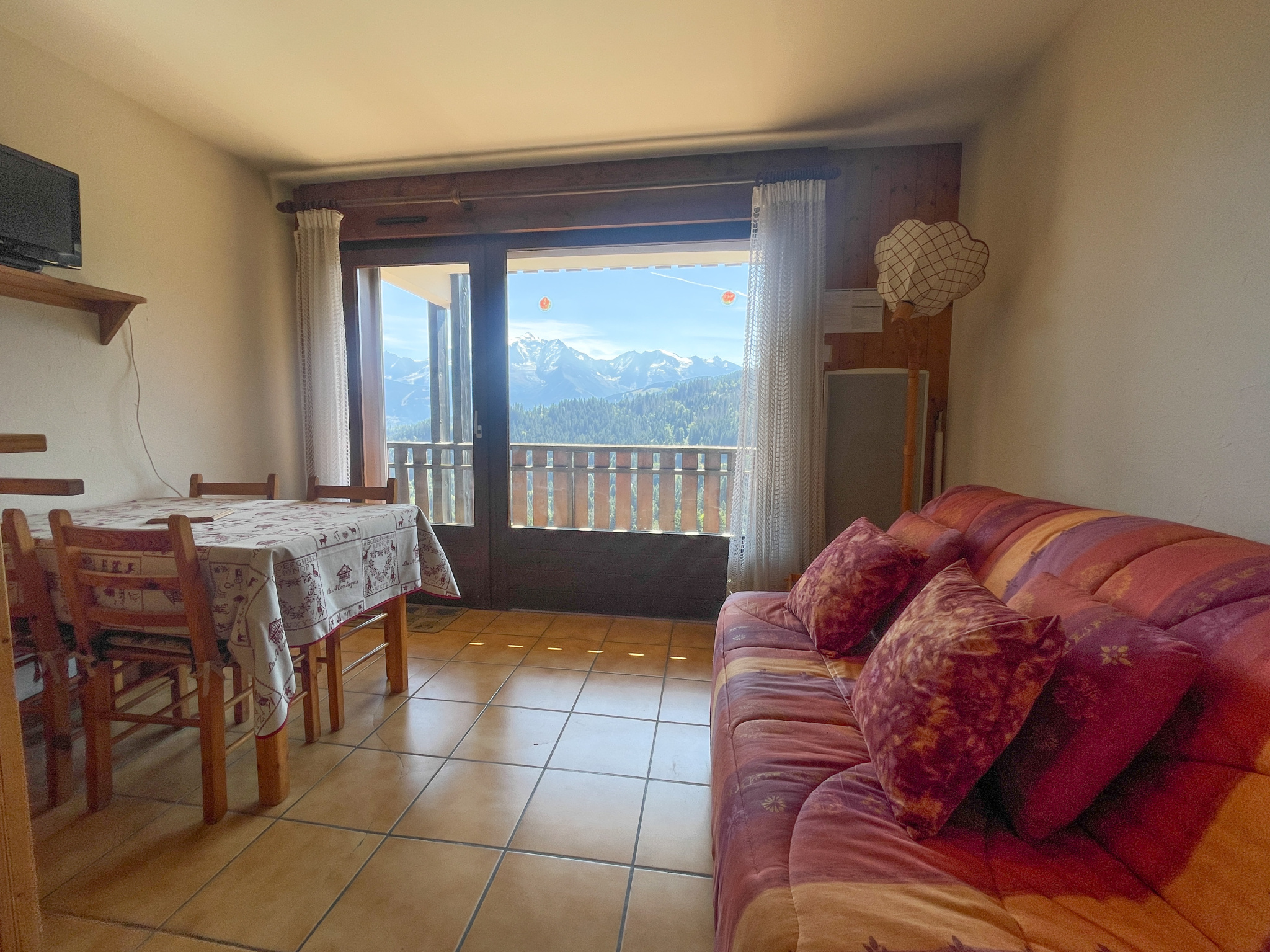 Le logement est composé d'une entrée avec coin nuit/montagne, un séjour avec kitchenette donnant accès à un balcon de 6m2 avec vue imprenable sur le massif du Mont-Blanc, une salle de bains, et un wc séparé.