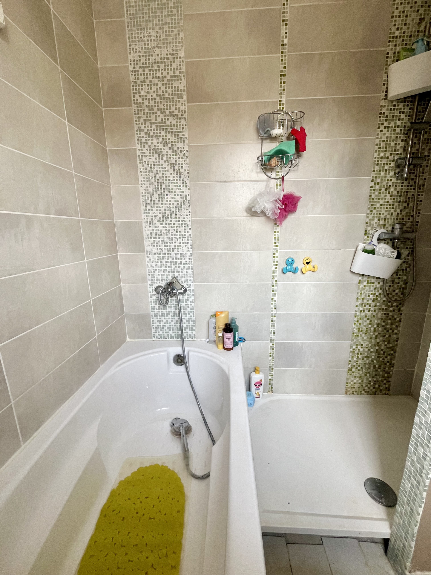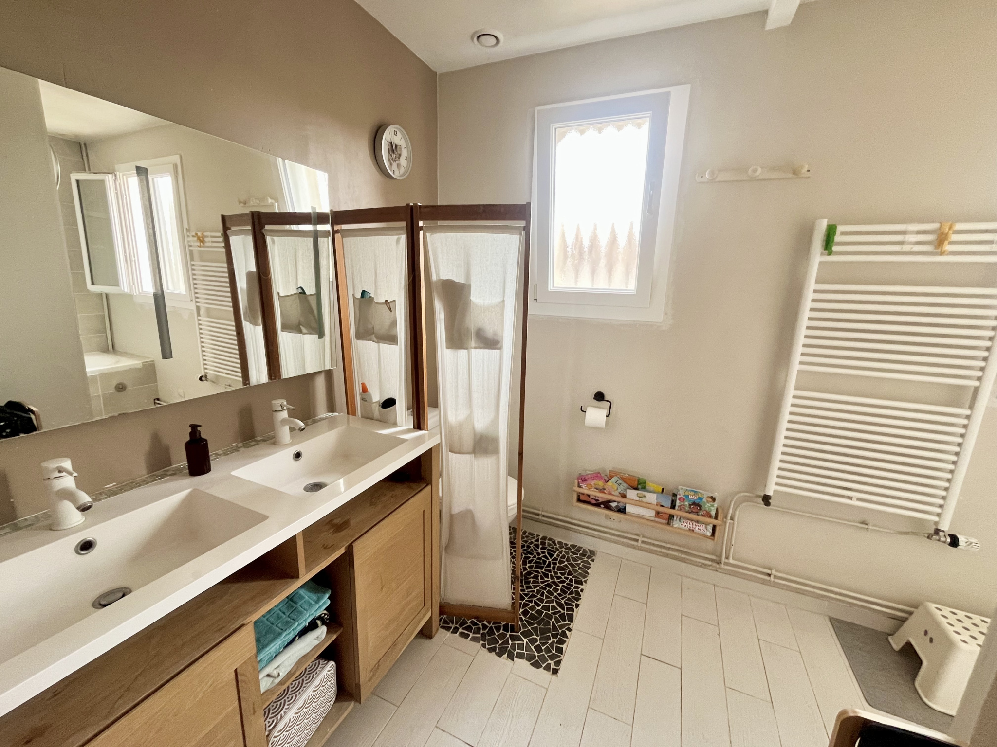 - Au 1er étage : palier, séjour double exposé plein sud, une cuisine aménagée, une salle de bains (baignoire + douche) avec WC.