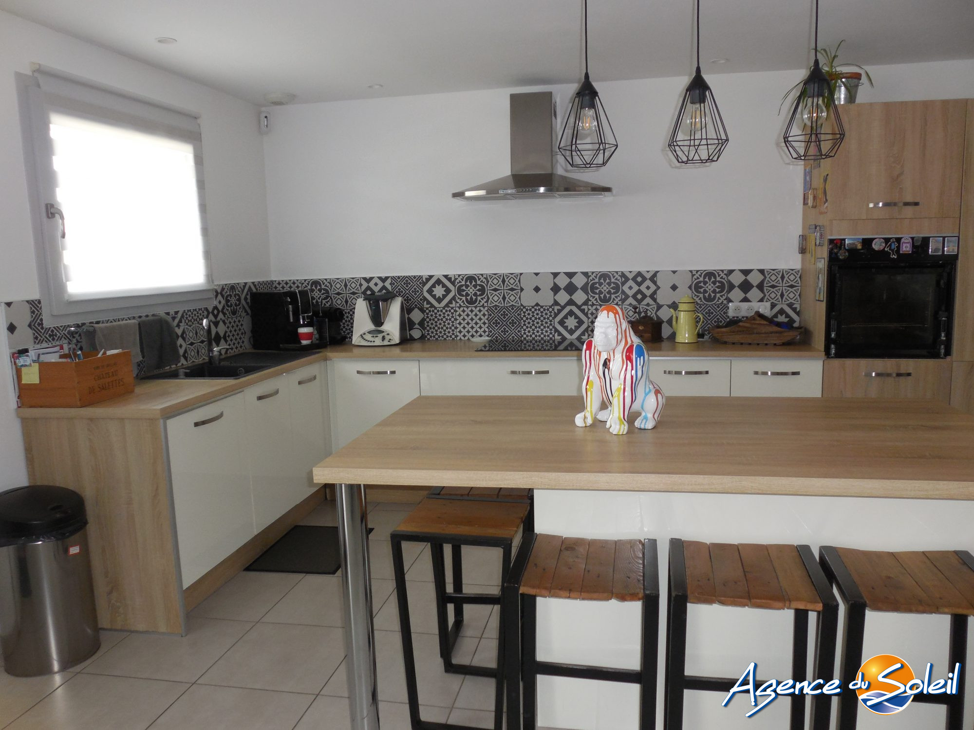 Cette villa très accueillante située dans une rue calme à 600 mètres du centre ville propose, sur un terrain de 260 m², une habitation de plain-pied récente et fonctionnelle. En effet, une grande pièce de vie lumineuse avec cuisine ouverte très bien équipée donne sur la terrasse et le jardin, 3 chambres spacieuses avec placard dont une ouvrant sur le jardin arrière, une salle d'eau avec fenêtre, un wc indépendant, un garage carrelé faisant office de rangement et de buanderie. Construite en 2016, elle respecte les normes RT 2012 avec une climatisation réversible gainée, un cumulus thermodynamique, une isolation performante. De plus, 11 panneaux solaires (17 m²), une prise pour voiture électrique, des fenêtres oscillo-battantes, une VMC double flux complètent ces prestations haut de gamme. Pour tout complément d'information, contactez Cécile NOGIER au 06.14.07.32.09 ou au 04.68.48.00.71. E-mail : vente.nogier@agencedusoleil.com