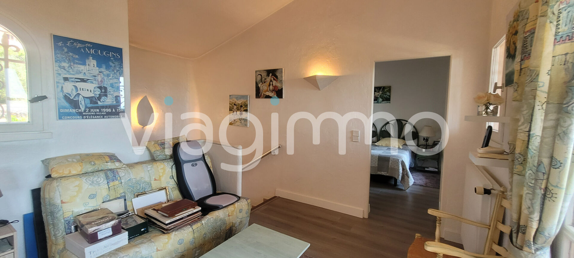 À l'étage, un palier aménagé en bureau dessert une troisième chambre avec salle d'eau et wc, prolongée par une loggia fermée offrant un aperçu mer.