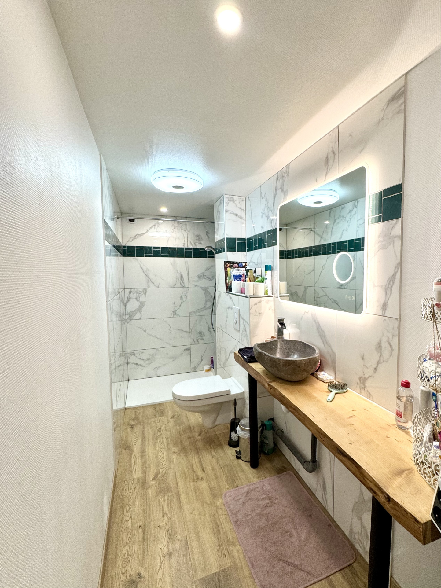 Au 1er étage : un palier dessert 2 chambres (18.93 m2 et 9.19 m2) ainsi qu'une salle de douche rénovée comprenant une grande douche à l'italienne, un meuble vasque, un wc et une fenêtre.