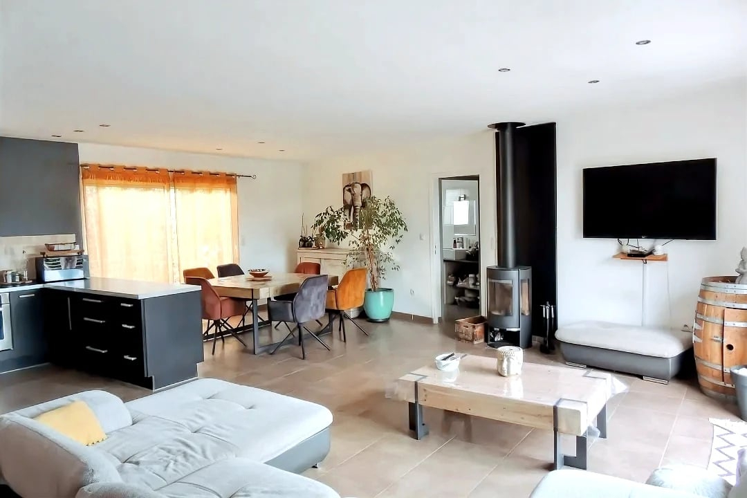 Vous tomberez sous le charme de ses grands espaces de vie lumineux, son séjour chaleureux avec poêle à bois pensée pour le confort au quotidien.