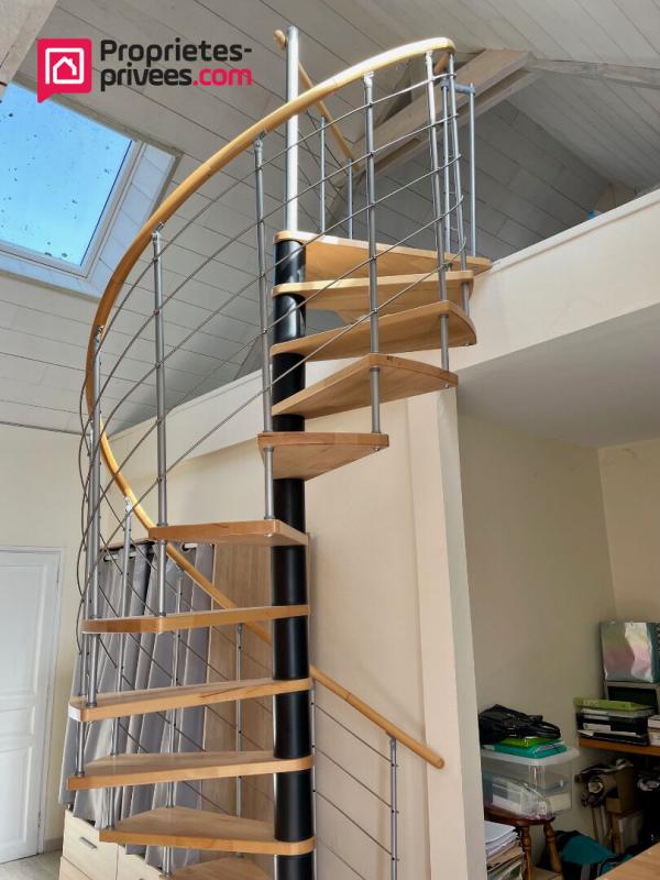 A l'étage 70m² environ, un appartement propose une pièce de vie lumineuse (27 m²), une chambre (11 m²) avec salle d'eau (3,6 m²), une cuisine (5 m²), un couloir grenier avec deux vélux (12 m²) et une mezzanine de 15 m².