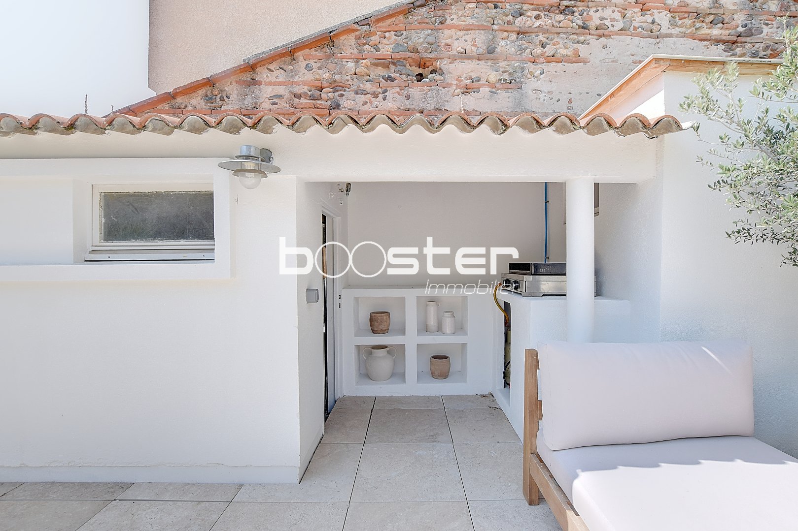 À l'extérieur, la magnifique terrasse exposée plein sud est un véritable havre de paix. Un lieu suspendu, baigné de soleil du matin au soir, parfait pour des instants privilégiés en toute intimité.
