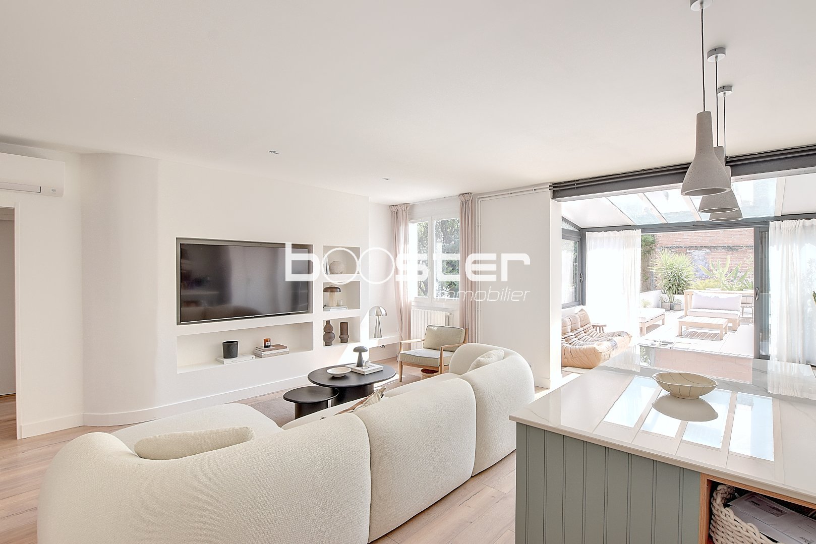 Dès l'entrée, le charme opère. Le vaste séjour baigné de lumière naturelle invite à la détente et à la convivialité, avec ses volumes généreux et son atmosphère apaisante. La cuisine, raffinée et parfaitement équipée, s'ouvre avec subtilité sur l'espace de vie, idéale pour recevoir ou simplement savourer le quotidien.