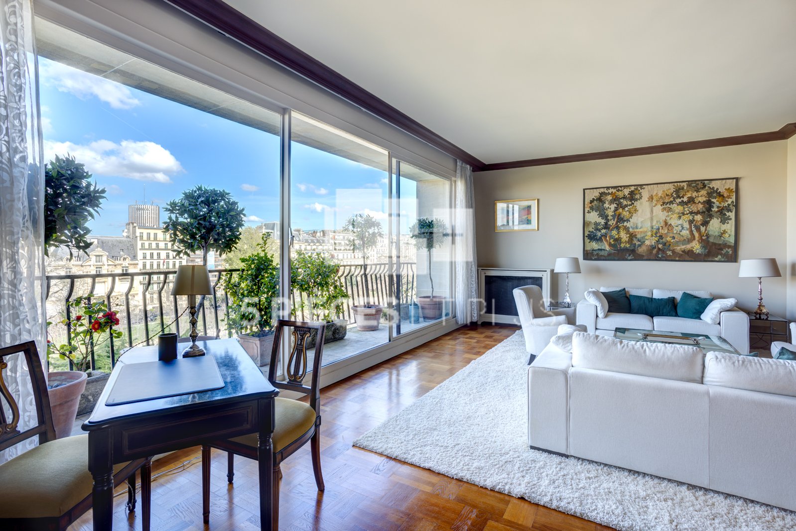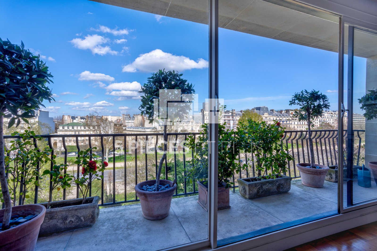 - d'un spacieux séjour avec de grandes baies vitrées donnant sur un BALCON/TERRASSE avec vue dégagée sur les jardins de l'Avenue Foch.