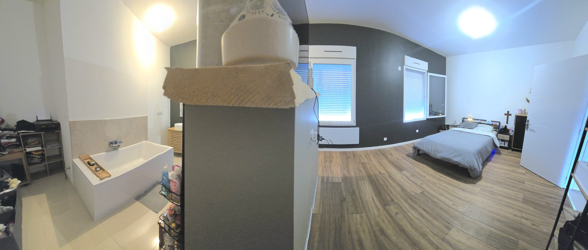 Pièce de vie avec lumière traversante munie de 2 baies et équipée d'un poêle à pellets, cuisine ouverte avec accès à une buanderie attenante, dégagement nuit comprenant : 2 chambres, salle d'eau (douche italienne, meuble vasque et bidet), wc indépendant et grande suite parentale avec dressing et salle de bains (baignoire et meuble vasque), car-port latéral d'environ 42 m2 !