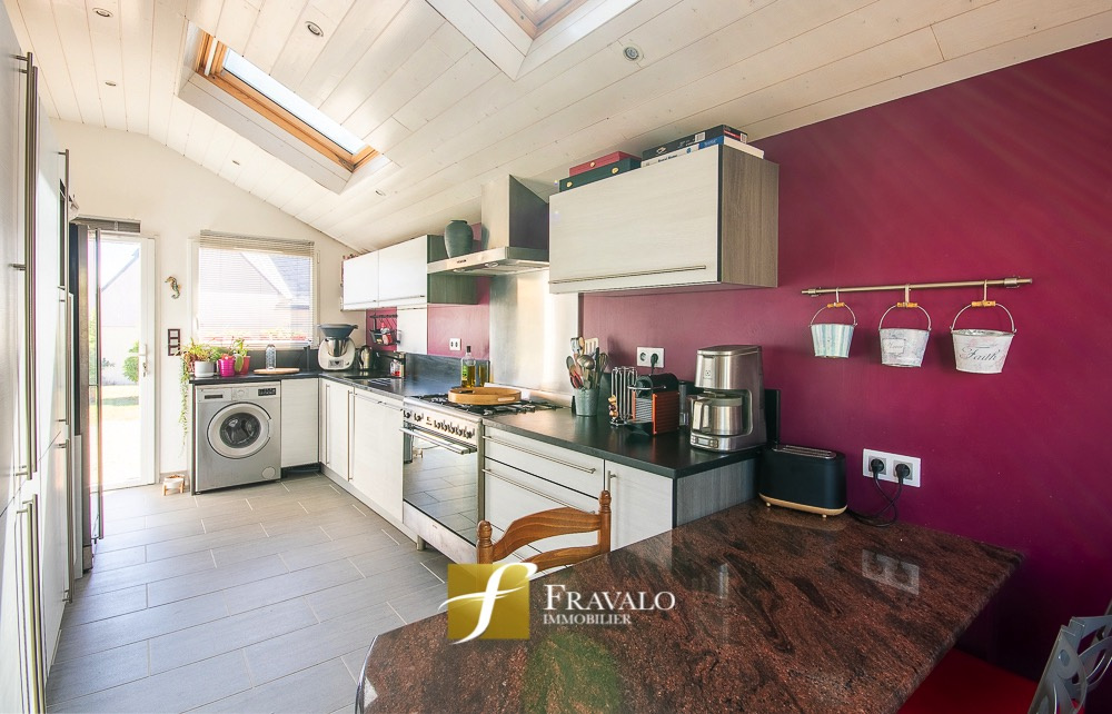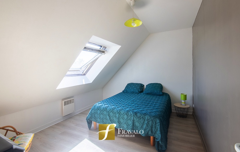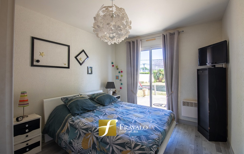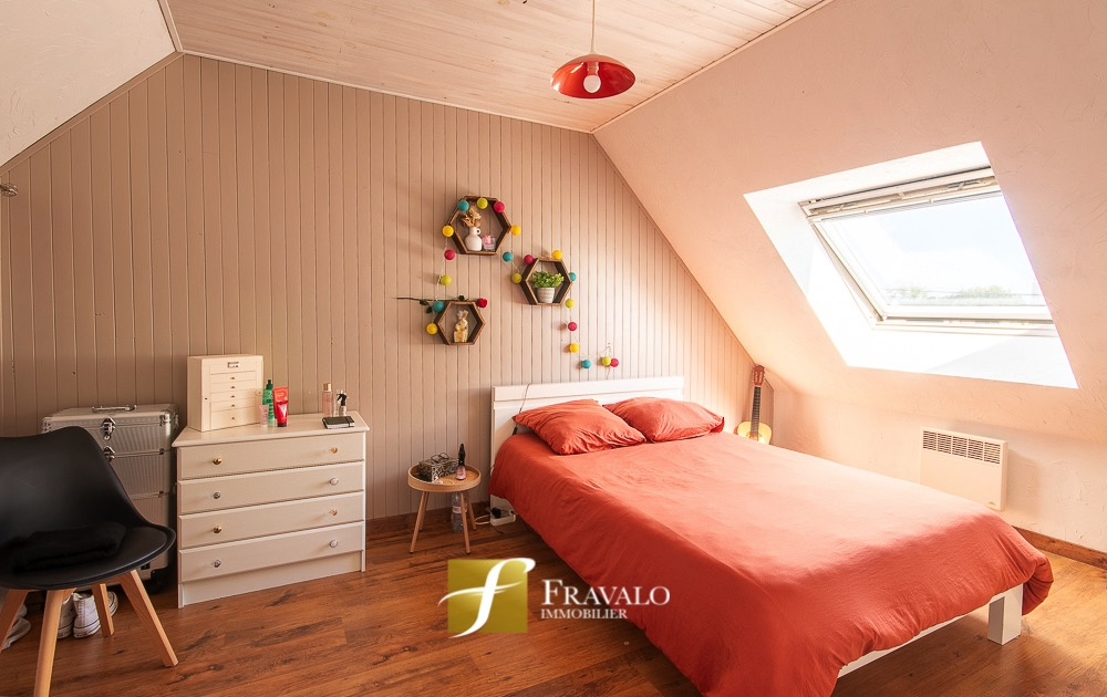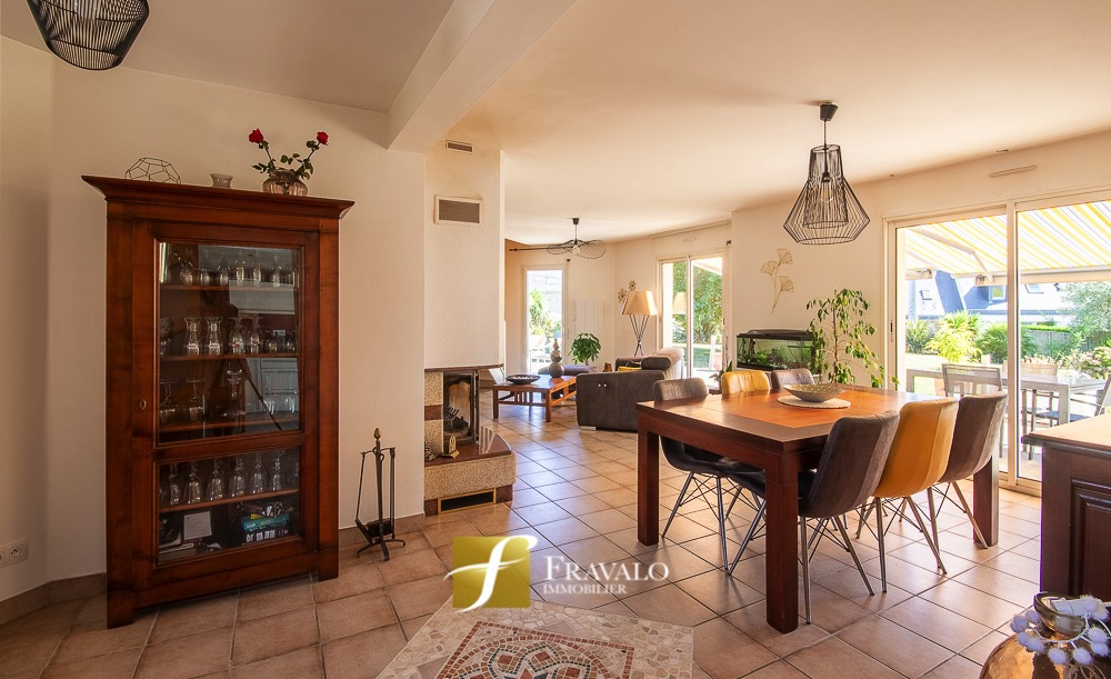 EXCLUSIVITE - Proche des sentiers côtiers du golfe du Morbihan, maison de 110 m2 construite en 1996, implantée sur un terrain de plus de 1400 m2. Le rez-de-chaussée se compose d'une entrée, d'un lumineux salon-séjour avec insert donnant accès à une terrasse exposée plein sud, d'une cuisine séparée aménagée-équipée, d'une chambre avec terrasse, d'une salle d'eau, d'un wc et d'un double garage. L'étage dessert trois chambres et une salle de bains avec wc. Un beau jardin arboré et un garage indépendant en annexe complètent la prestation. Estimation de coûts annuels d'énergie pour un usage standard du logement: entre 1159 EUR et 1567 EUR (abonnement compris). Les informations sur les risques auxquels ce bien est exposé sont disponibles sur le site Géorisques : georisques.gouv.fr