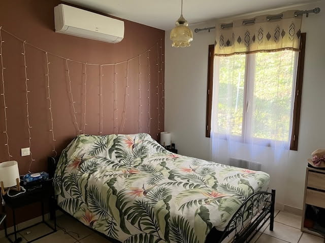 Bâtie sur une parcelle arborée de 1500m2, offrant une vue dégagée grâce à sa position dominante, cette maison se compose d'une grande pièce de vie de 38m2 où la cuisine aménagée est ouvert sur le séjour. Côté nuit, la maison comprend trois chambres, chacune avec placards intégrés, d'une salle d'eau et d'un toilette indépendant. Chaque pièce est climatisée et le séjour dispose en plus d'un poêle à granules. Un cellier et un garage attenant viennent compléter le tout.