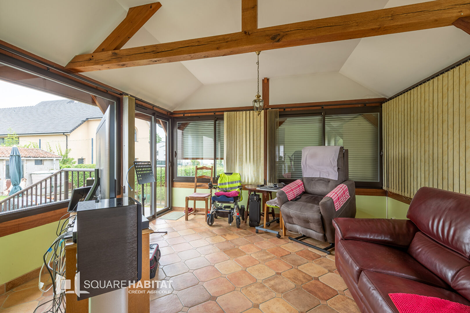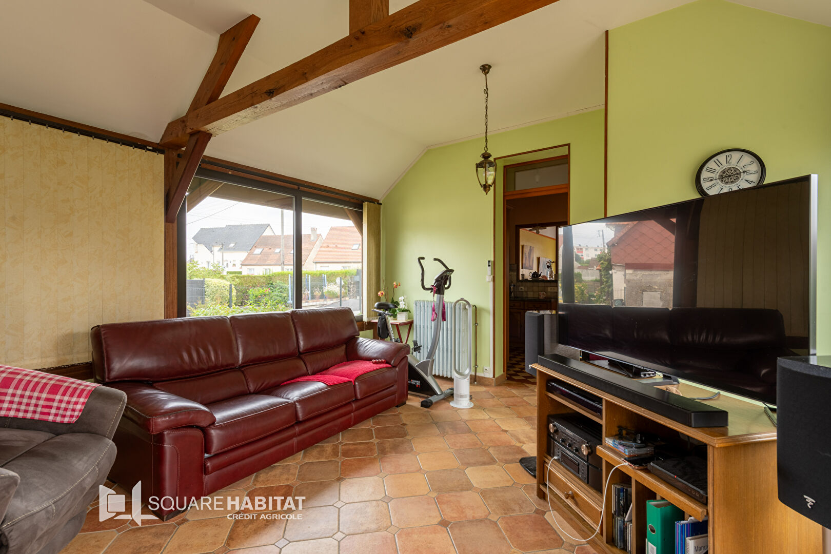 D'une entrée, cuisine aménagée ouverte sur salon et grand séjour avec une belle hauteur de plafond sur une extension de la maison, 2 chambres, salle de douche, wc