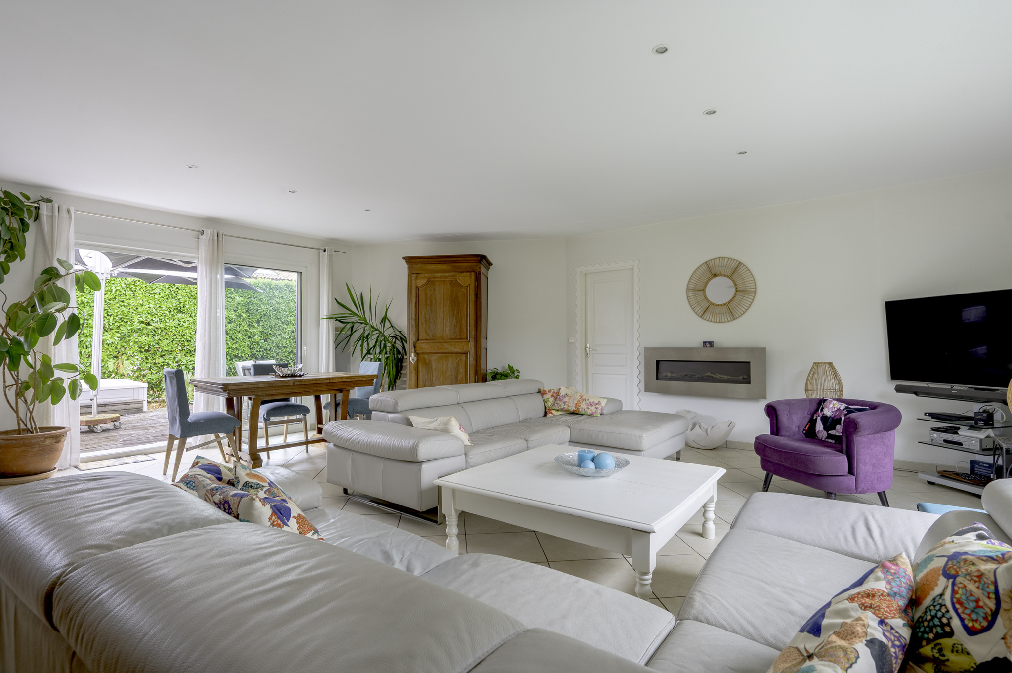 Espace de vie lumineux : Salon-séjour de plus de 50 m2 avec grandes baies vitrées ouvrant sur plusieurs terrasses pour profiter du jardin à tout heure.