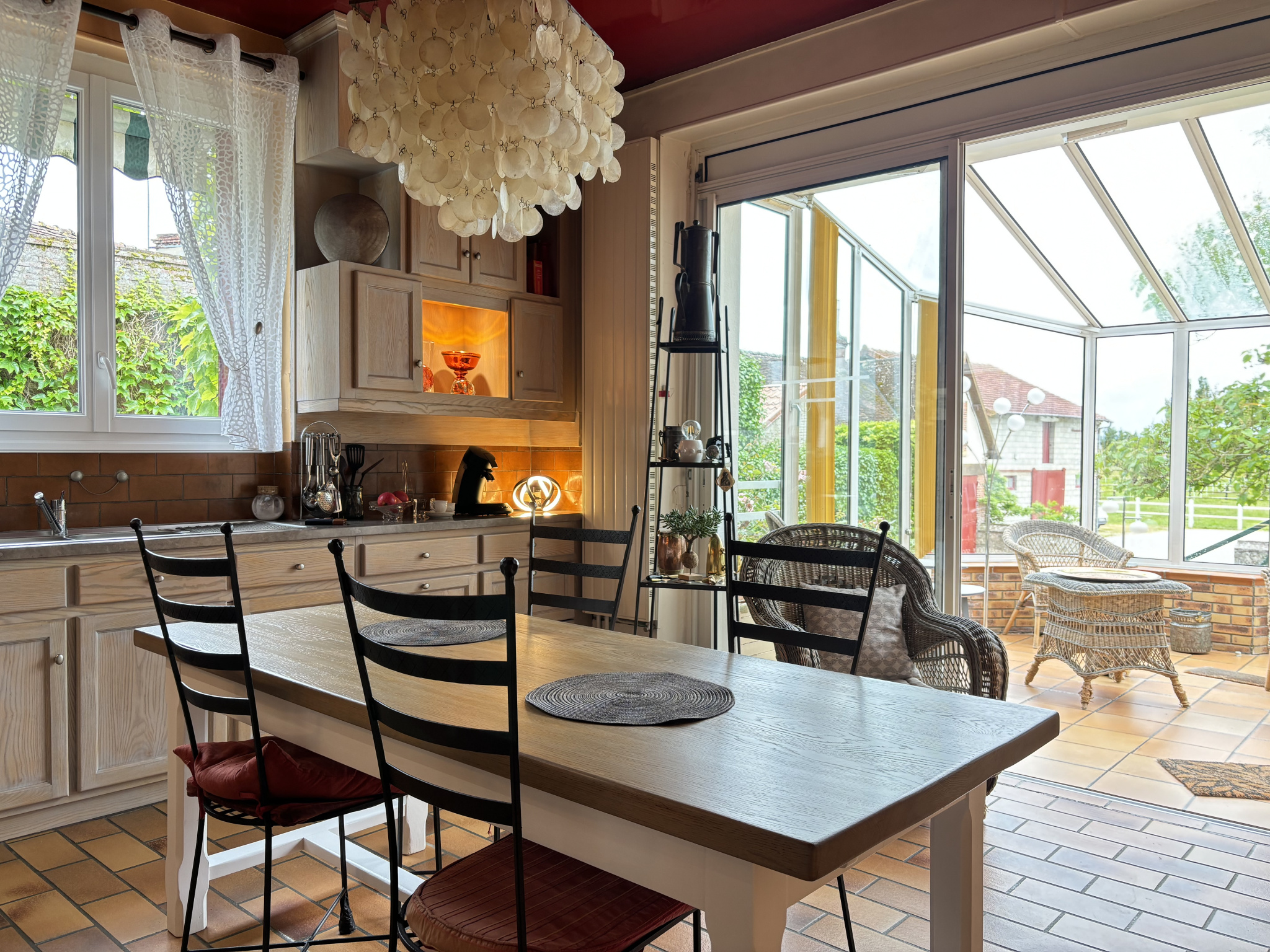 Édifiée dans les années 50, cette belle maison familiale de 195 m2, au coeur du bourg, a conservé tout le charme de ses matériaux d'origine : parquets, escaliers, cheminées. Elle propose : séjour, salon, cuisine équipée, véranda ouvrant sur terrasse, bureau, buanderie, ainsi que 4 chambres à l'étage, salle de bains et dressing. Le second étage offre encore du potentiel avec 2 chambres à rénover et 2 greniers.