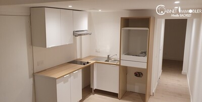 Appartement avec large fenêtre coulissante double vitrage, entièrement isolé, cuisine et sanitaires neufs. L'habitation est composée d'une pièce à vivre et d'une pièce qui pourra être une belle chambre avec placard.