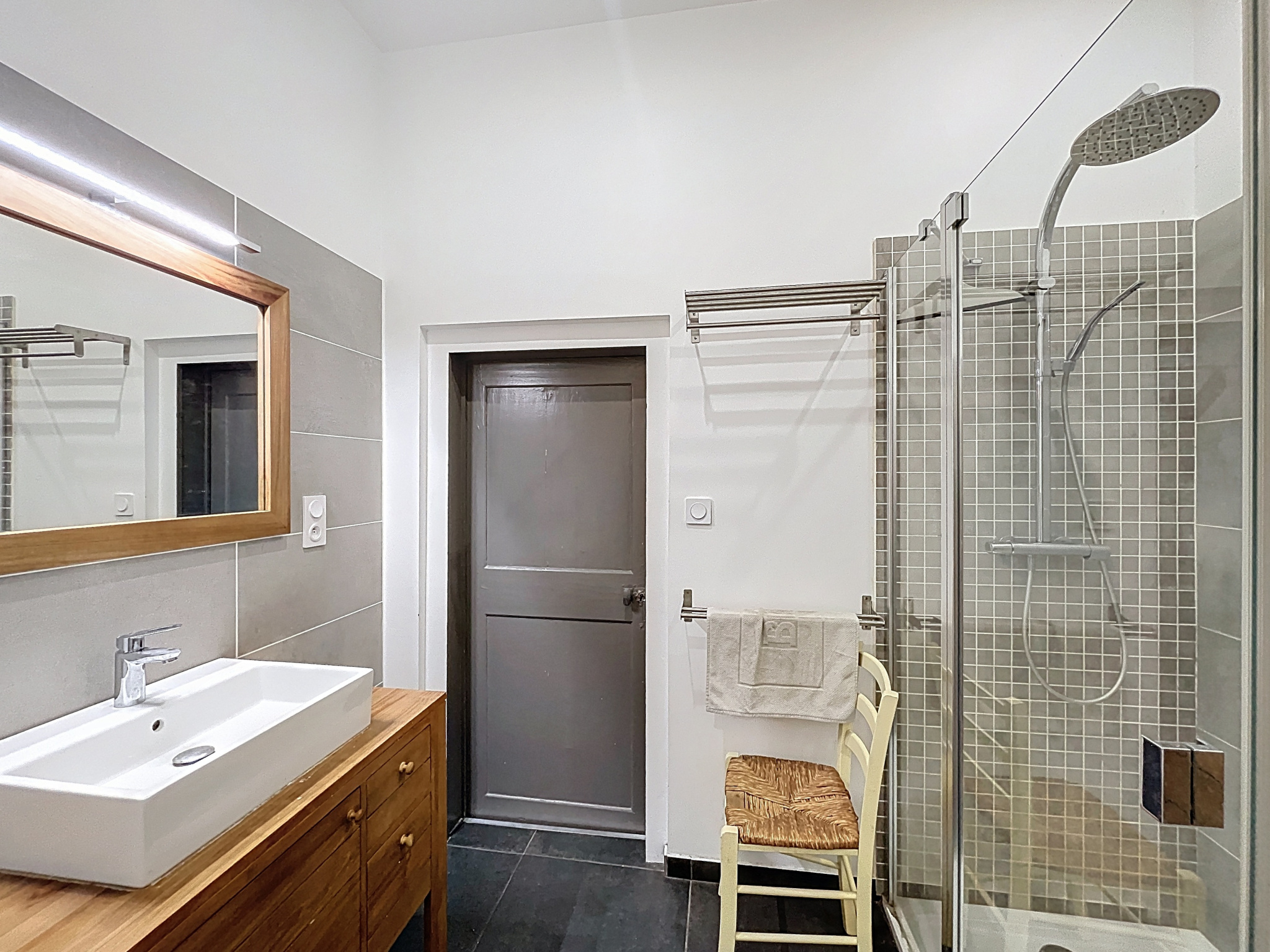 - Salle d'eau (6,20m2) : sol carrelage, douche, vasque sur meuble bas, WC ;