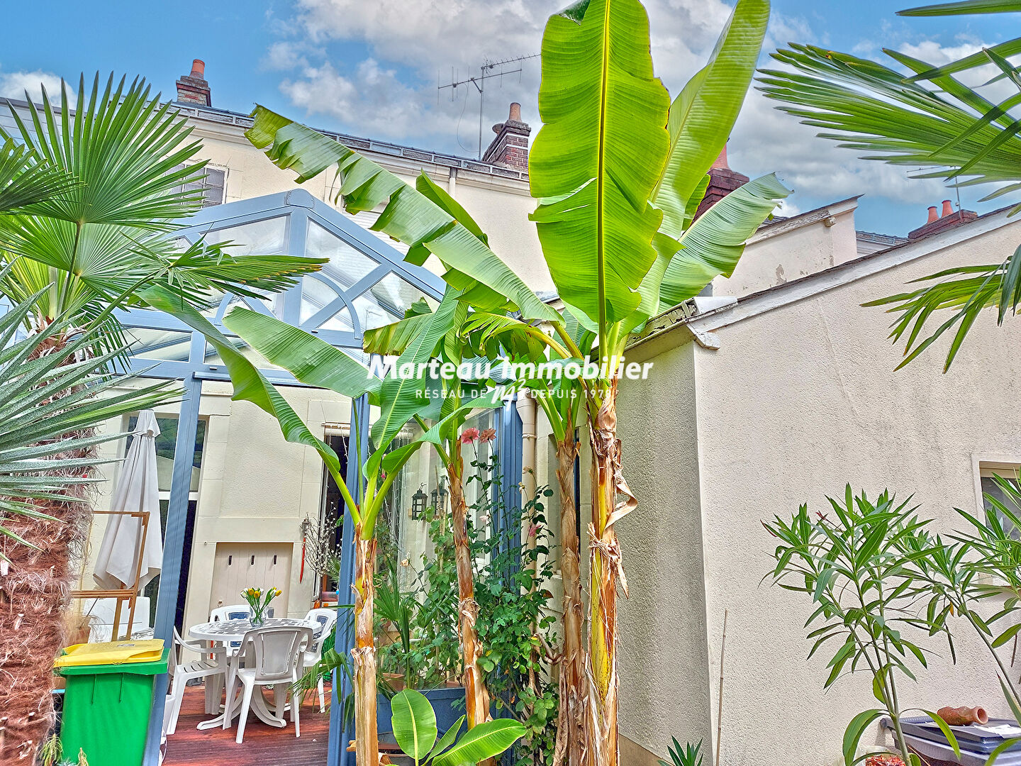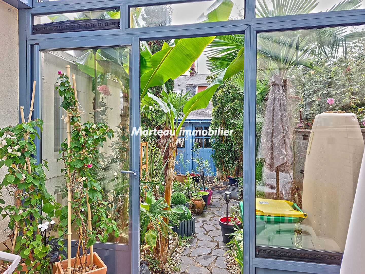 Véranda et terrasse en caillebotis donnant sur un jardinet clos, exposé plein sud, sans vis-à-vis