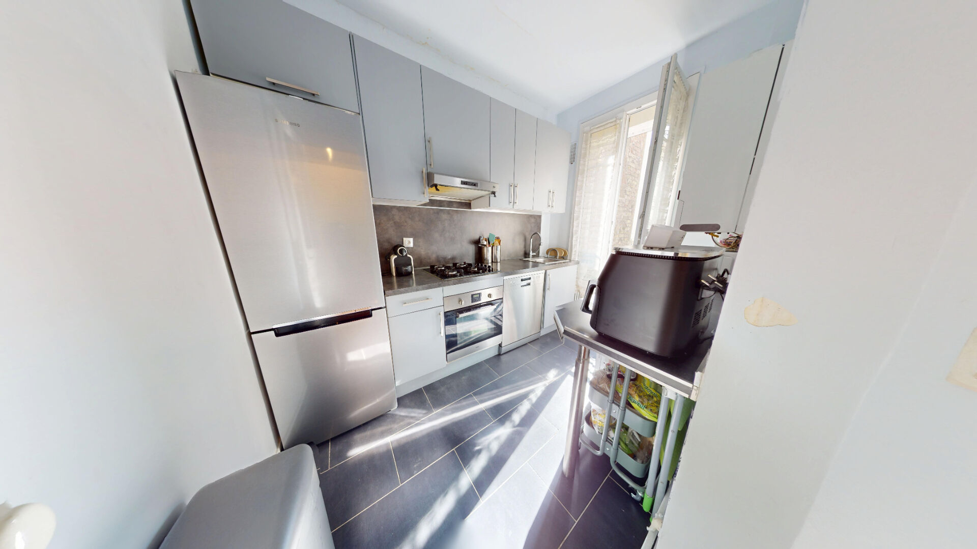 Cuisine indépendante, aménagée et équipée d'un frigo, d'un four, d'une hotte, d'une chaudière individuelle au gaz et de deux arrivées/évacuations d'eau pour machine à laver et lave-vaisselle, avec VMC.