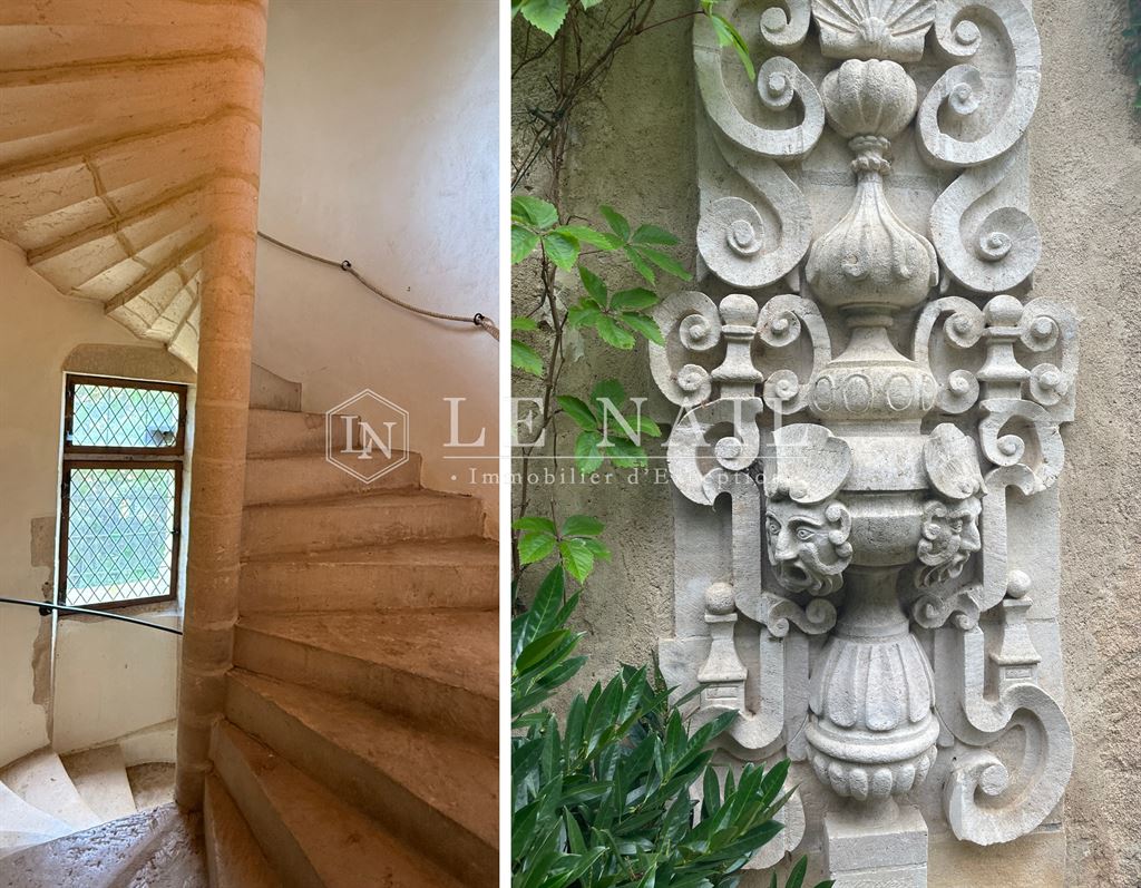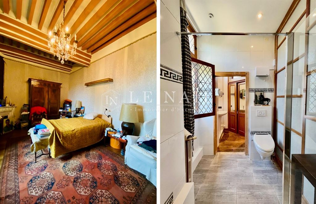 Au rez-de-chaussée : d’un côté, un jardin d’hiver prolongé par une cave et un séjour lumineux donnant sur la cour. De l’autre côté, il mène à une remarquable salle à manger aux superbes croisées d’ogives, suivie d’une cuisine intime. Une chambre complète ce niveau.