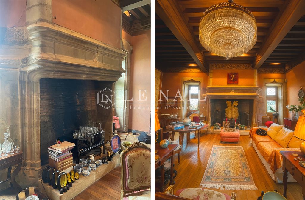 Le premier étage abrite également un salon raffiné au caractère historique, orné d’une imposante cheminée en pierre et d’un plafond à la française.